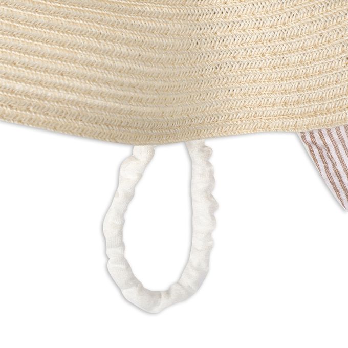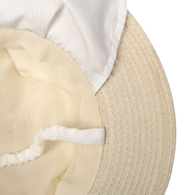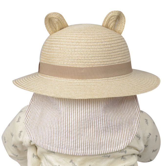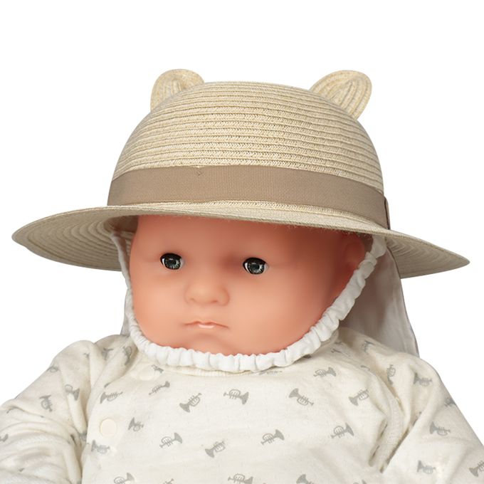 有附外出活動時非常需要的防曬遮陽布。下巴有鬆緊帶可防止被風等吹落。下巴鬆緊帶用布料裹住,使膚觸更舒適。