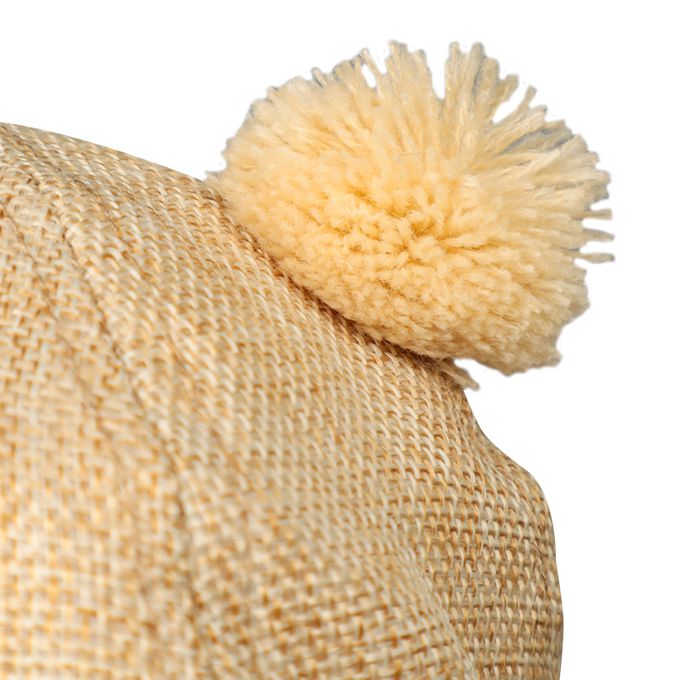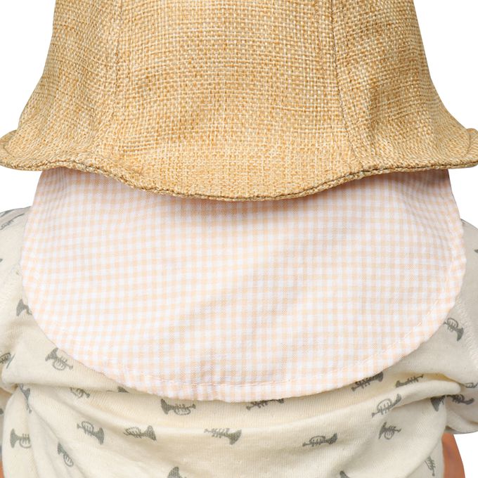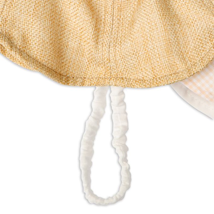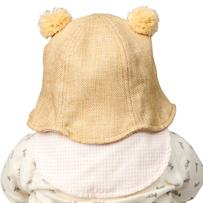 下巴有鬆緊帶可防止被風等吹落。下巴鬆緊帶用布料裹住,使膚觸更舒適。