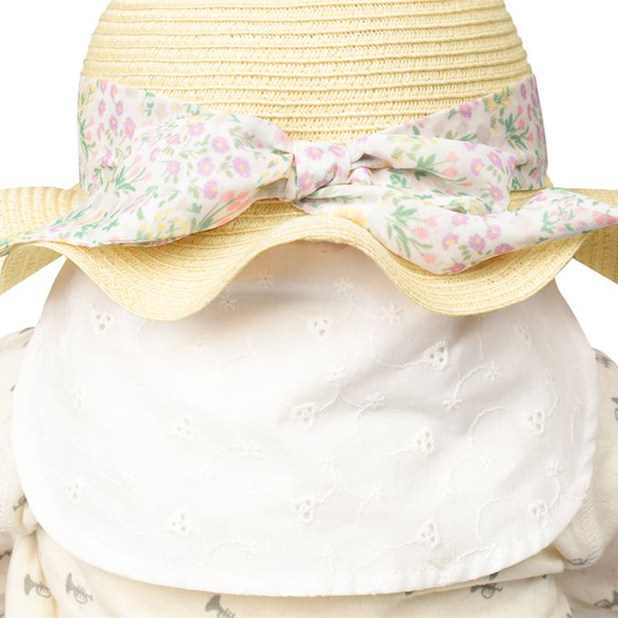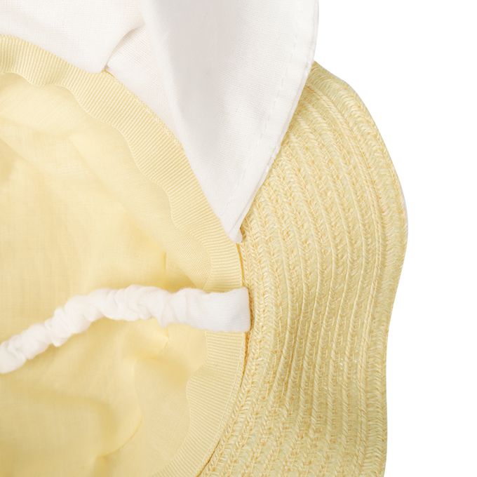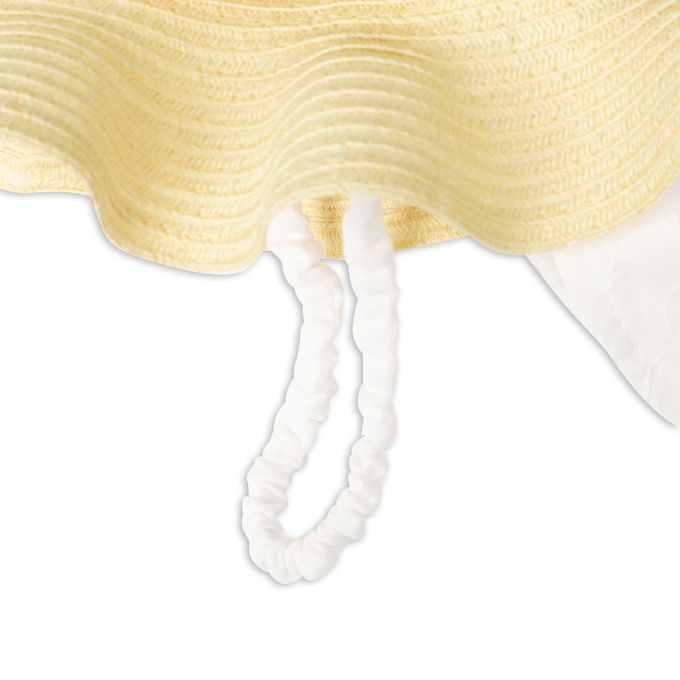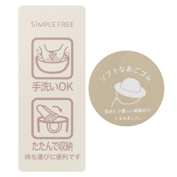 下巴有鬆緊帶可防止被風等吹落。下巴鬆緊帶用布料裹住,使膚觸更舒適。