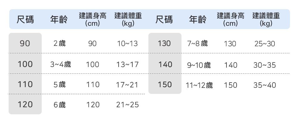 2. 建議年齡僅供參考。尺寸表乃依平均值制定,每位孩童發育情形不同,請參考模特試穿資訊、既有衣物等,並依實際測量結果為準。(建議可測量孩子目前穿著的衣物尺寸作為參考)