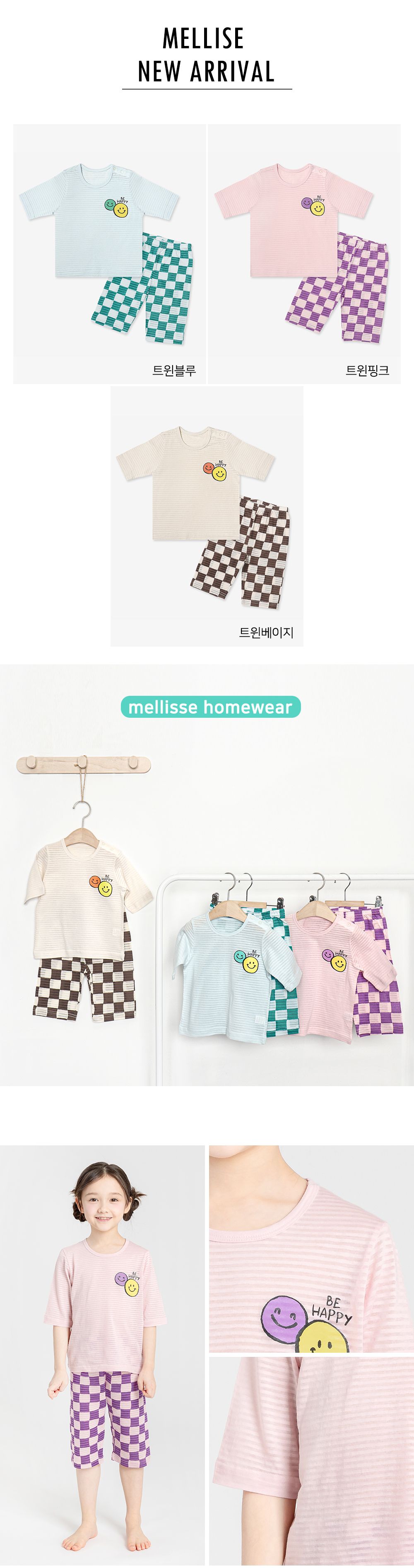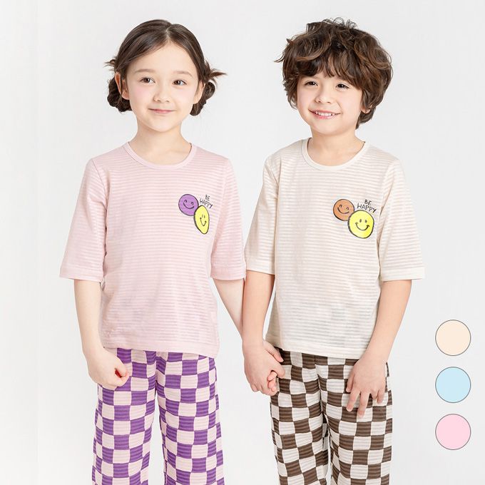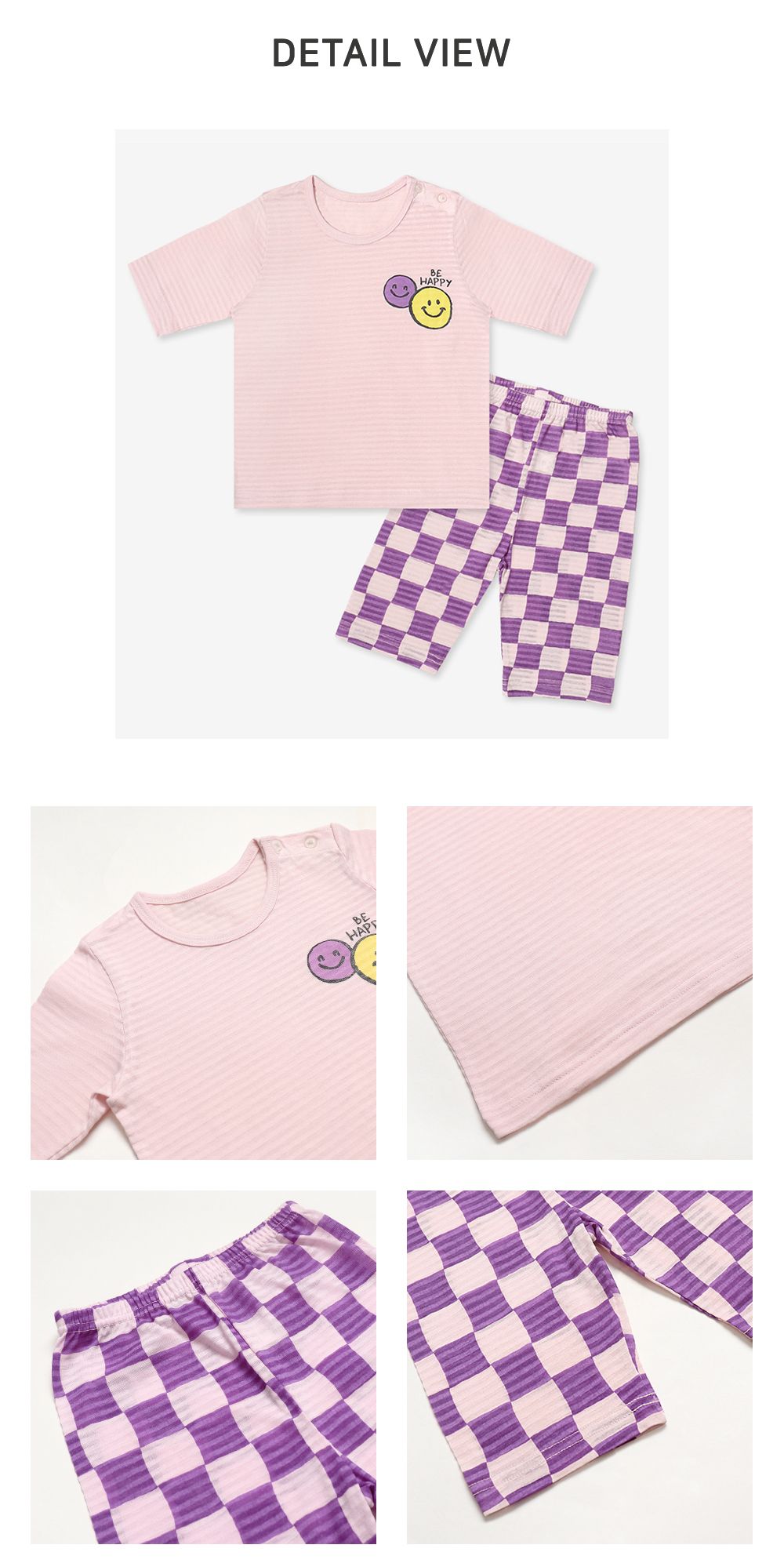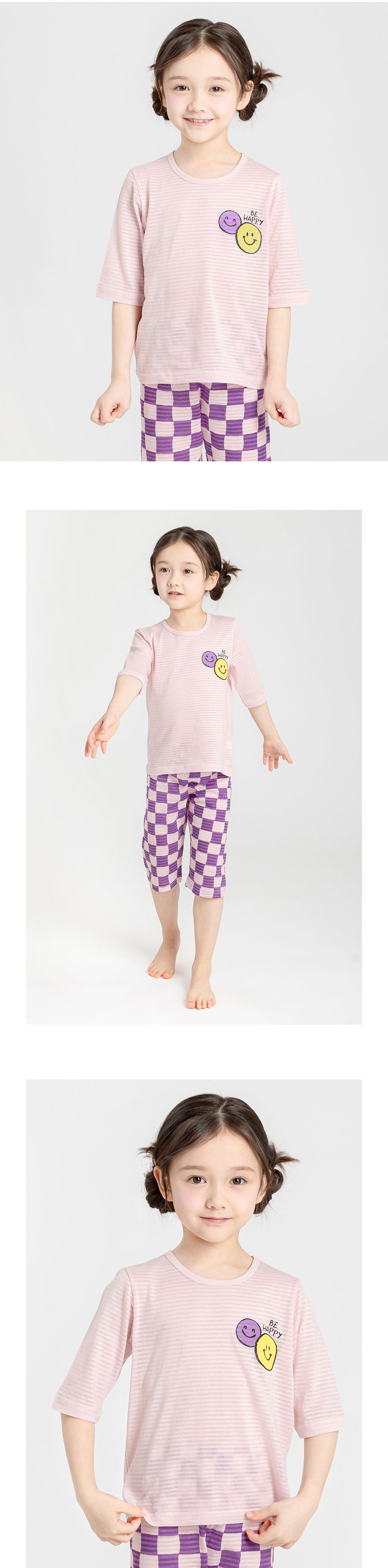 韓國 Mellisse - 韓製輕薄透氣7分袖家居服(無螢光棉)-笑臉X格紋-粉X紫