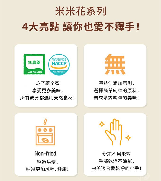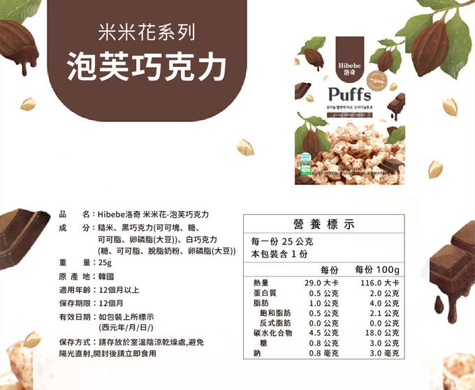 成分:米米花-泡芙巧克力:糙米、黑巧克力(可可塊、糖、可可脂、卵磷脂(大豆))、白巧克力(糖、可可脂、脫脂奶粉、卵磷脂(大豆) -- 米米花- 韓國草莓白巧:糙米、白巧克力(糖、可可脂、脫脂奶粉、卵磷脂(大豆)、冷凍乾燥草莓粉 -- 米米花- 韓國起司白巧:糙米、白巧克力(糖、可可脂、脫脂奶粉、卵磷脂(大豆))、卡芒貝爾起司粉