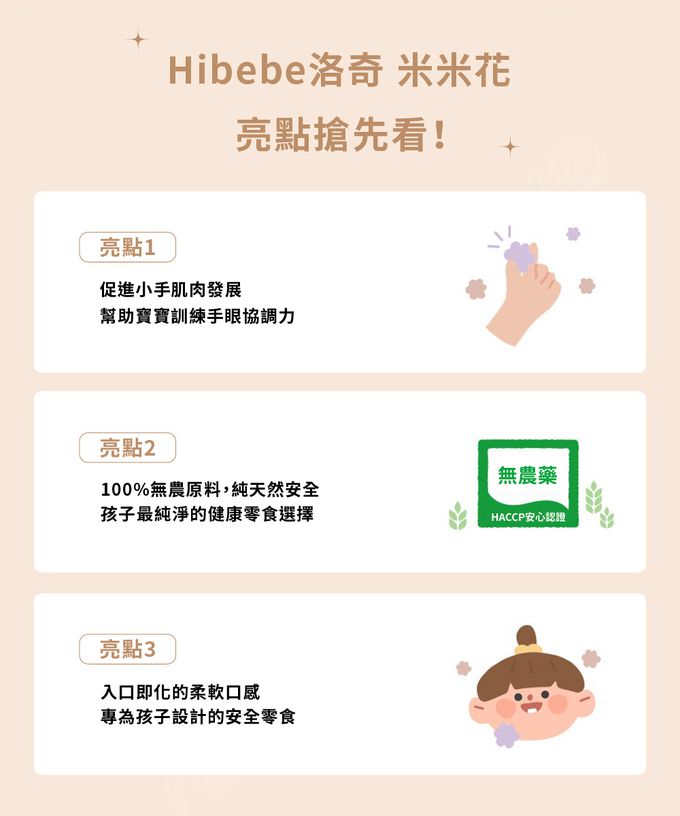 成分:米米花-ABC(蘋果、胡蘿蔔、甜菜根):白米、碳酸鈣、蘋果汁、胡蘿蔔粉、甜菜粉 --- 米米花-李子:白米、黑米、碳酸鈣、蘋果汁、李子濃縮果汁