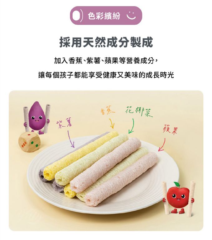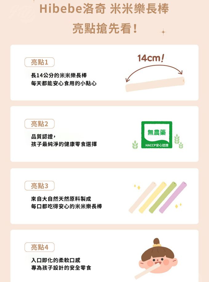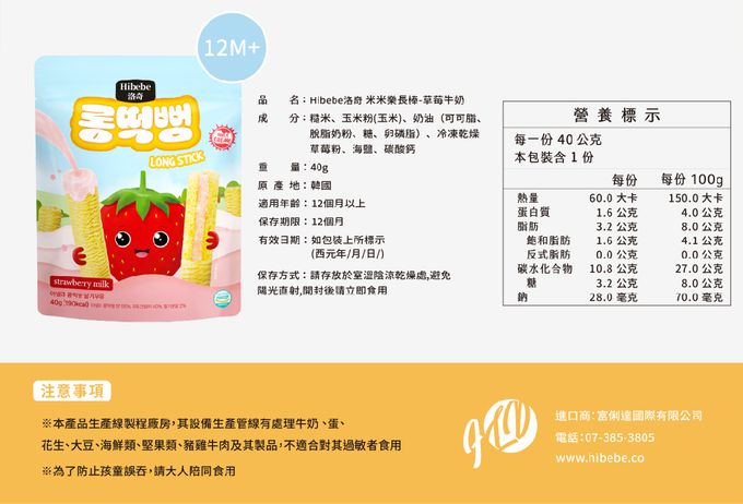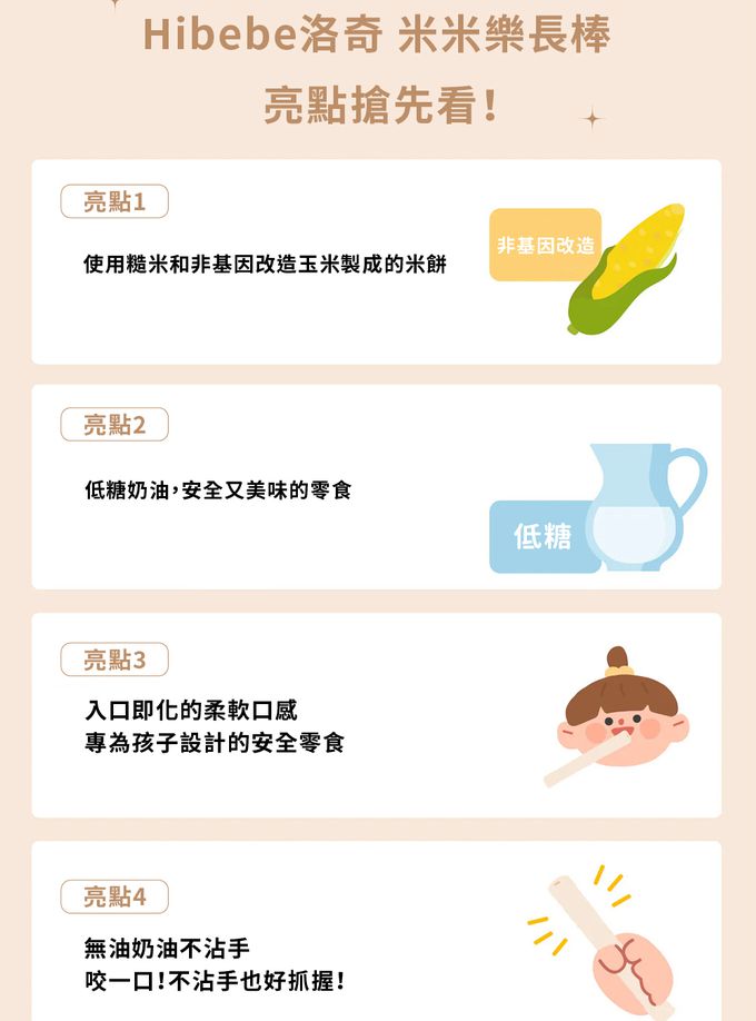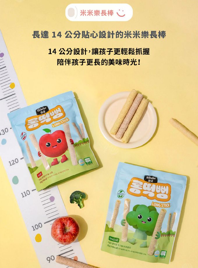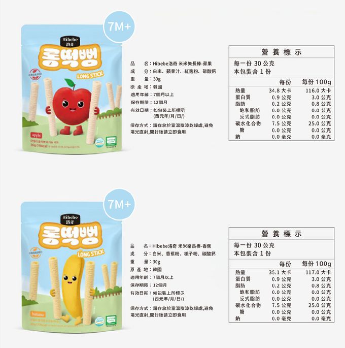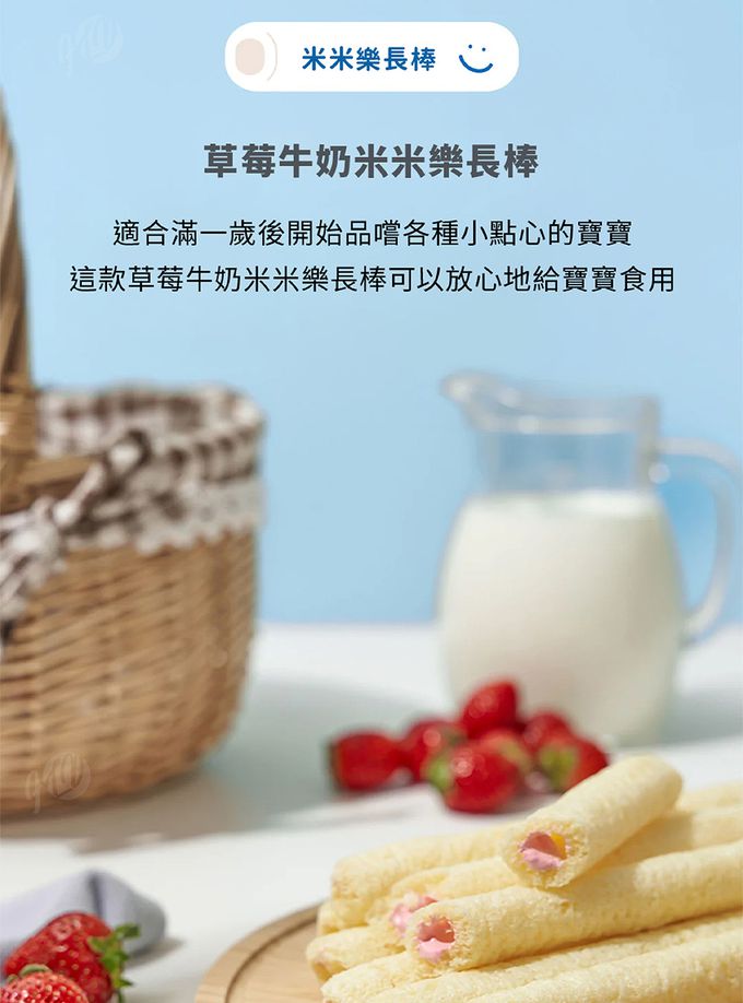 成分:米米樂長棒-蘋果:白米、蘋果汁、紅麴粉、碳酸鈣 -- 米米樂長棒-香蕉:白米、香蕉粉、梔子粉、碳酸鈣 -- 米米樂長棒-花椰菜:白米、綠花椰菜粉、綠藻粉、碳酸鈣 -- 米米樂長棒-紫薯:白米、黑米、紫薯粉、碳酸鈣 -- 米米樂長棒 -草莓牛奶:糙米、玉米粉(玉米)、奶油(可可脂、脫脂奶粉、糖、卵磷脂)、冷凍乾燥草莓粉、海鹽、碳酸鈣