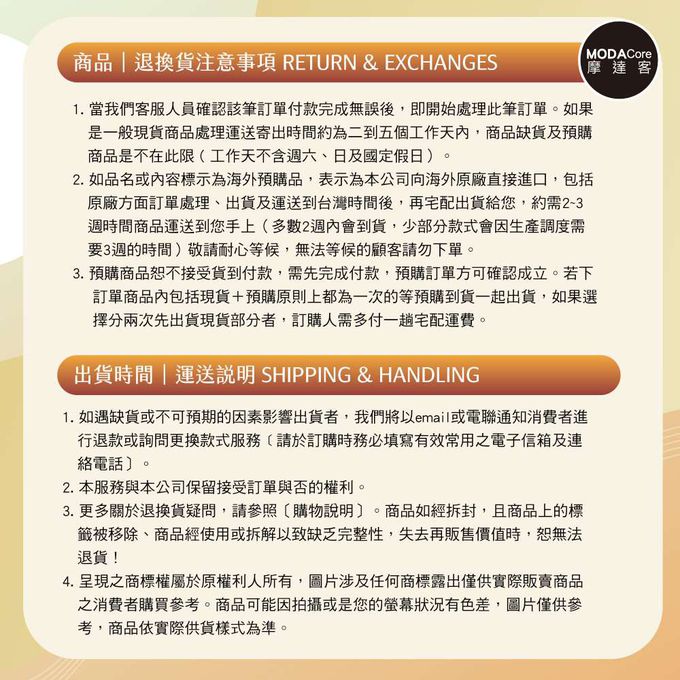 預購商品:預購為海外同步代購,遇缺貨即會通知媽咪並協助取消退款事宜。