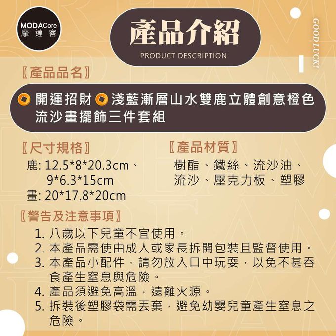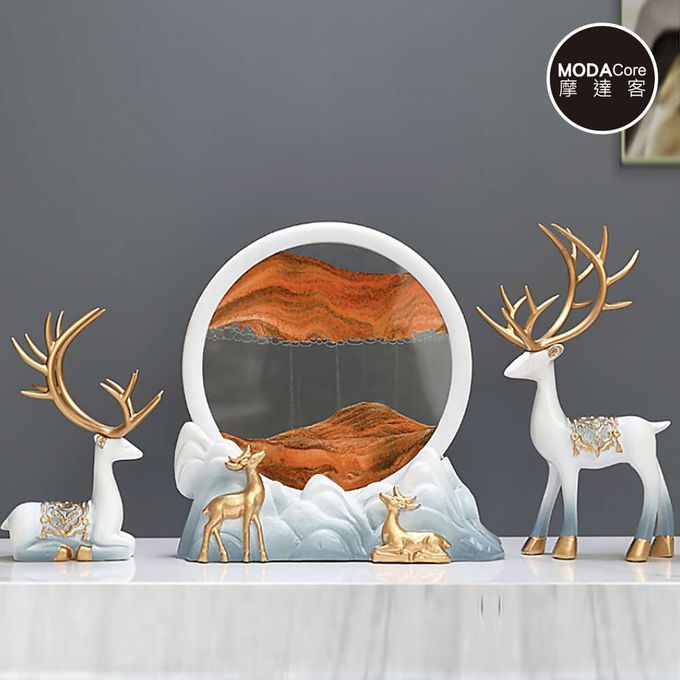 品名:◉開運招財◉淺藍漸層山水雙鹿立體創意橙色流沙畫擺飾三件套組_客廳玄關臥室好風水好運勢