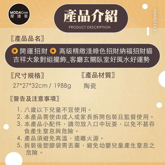 品名:◉開運招財◉高級精緻淺綠色招財納福招財貓吉祥大象對組擺飾_客廳玄關臥室好風水好運勢