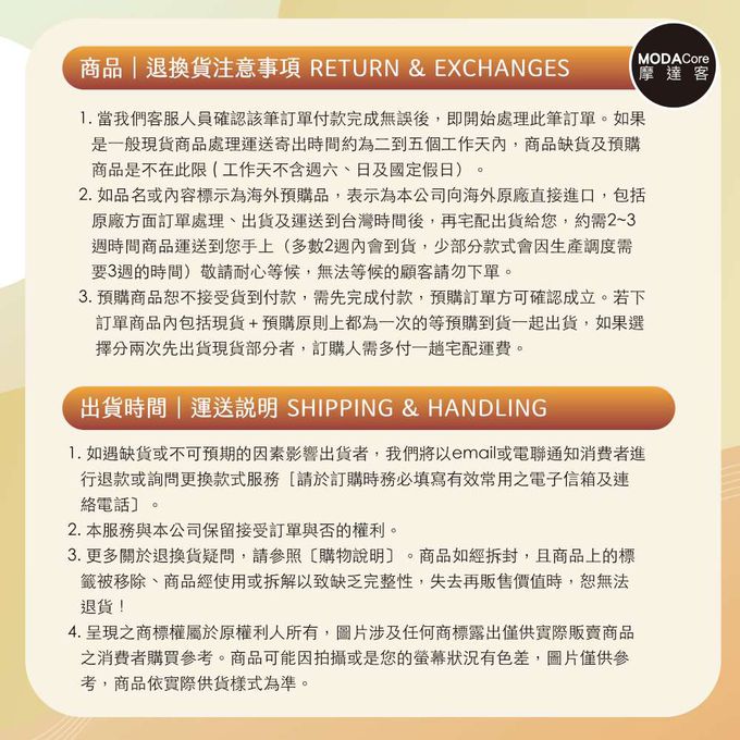 預購商品:預購為海外同步代購,遇缺貨即會通知媽咪並協助取消退款事宜。