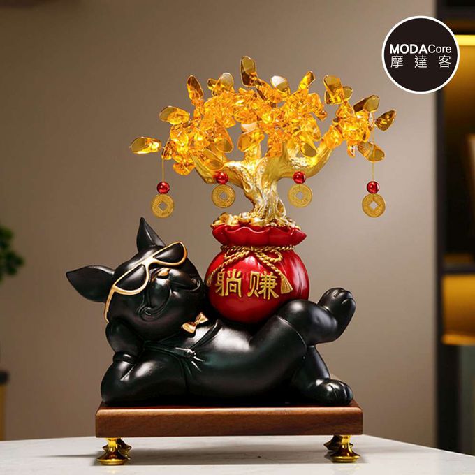 ◉開運招財◉創意時尚黑色躺賺帥氣法鬥犬狗抱紅百寶錢袋發財樹擺飾組_客廳玄關臥室好風水好運勢