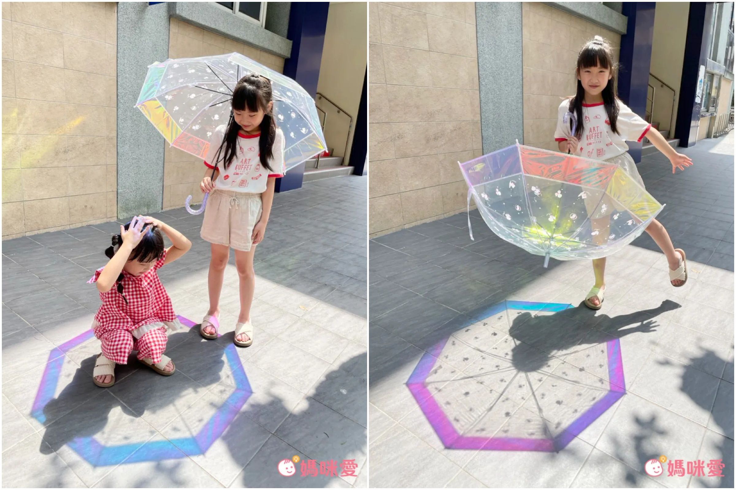 雨天對我們家孩子來說不再是難受,而是期待😍你看看這幾張照片📸陽光一照到傘,地上竟然映出彩色光圈,女兒還說這是她的"魔法圈",在雨中散步變得更夢幻了🪄