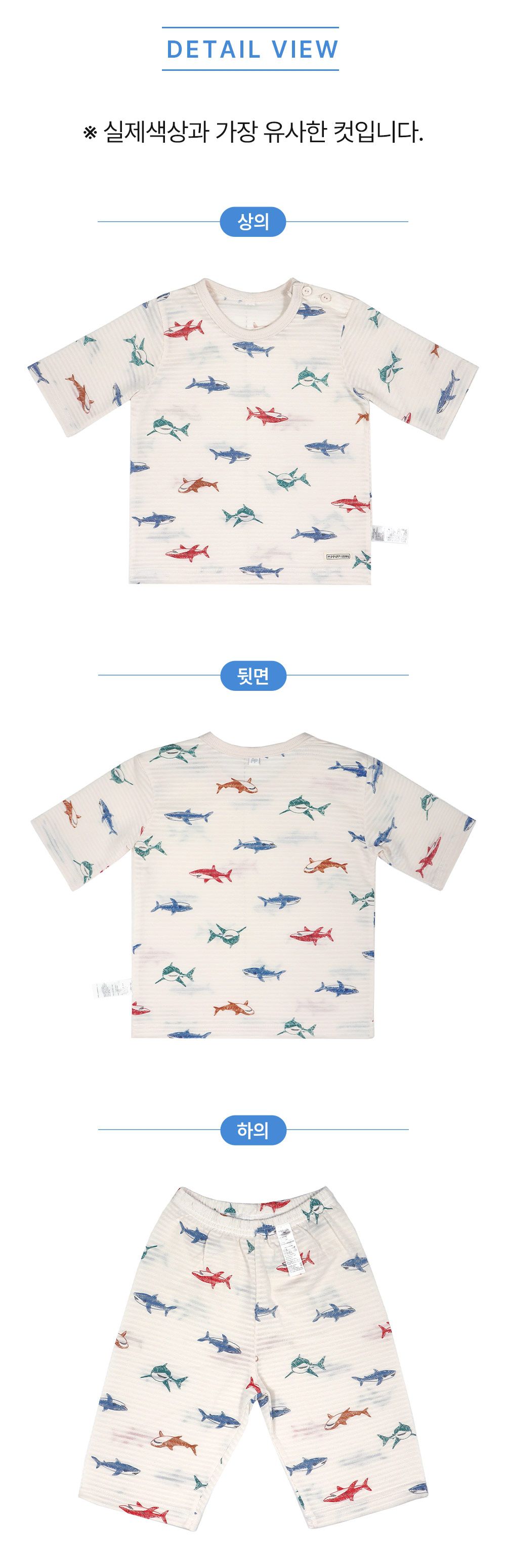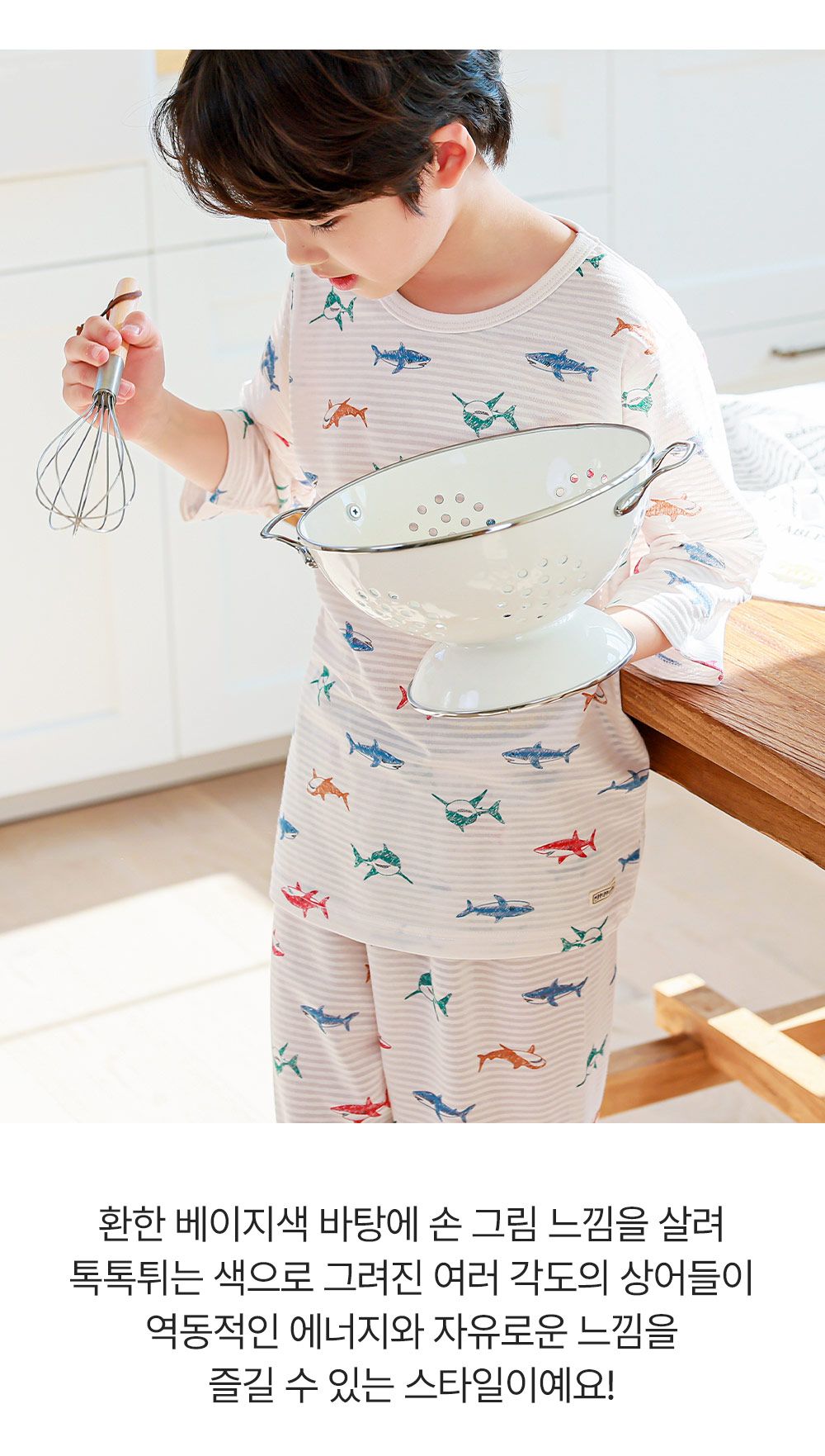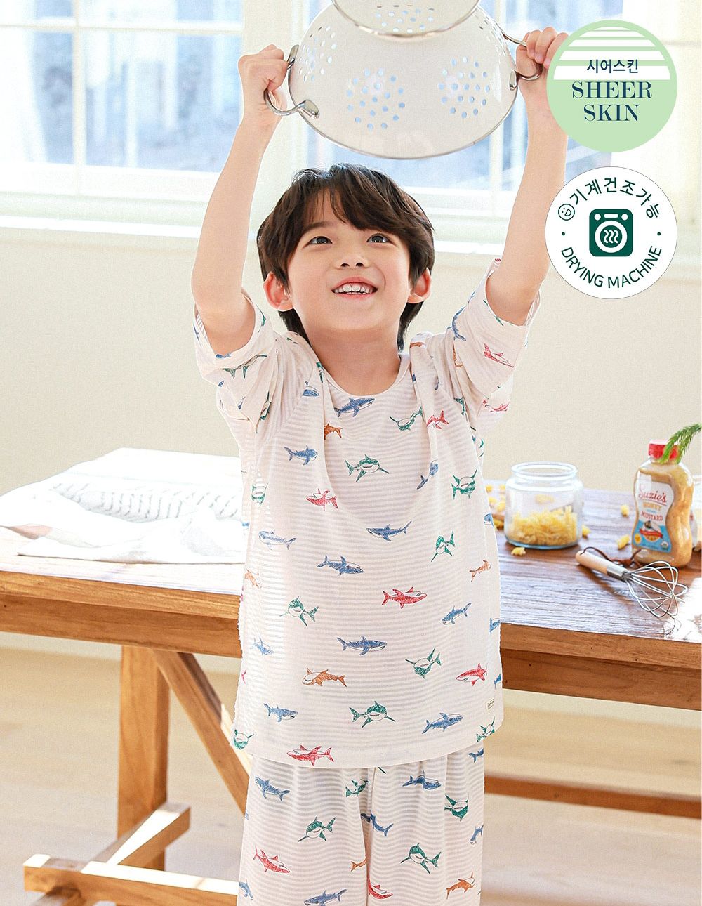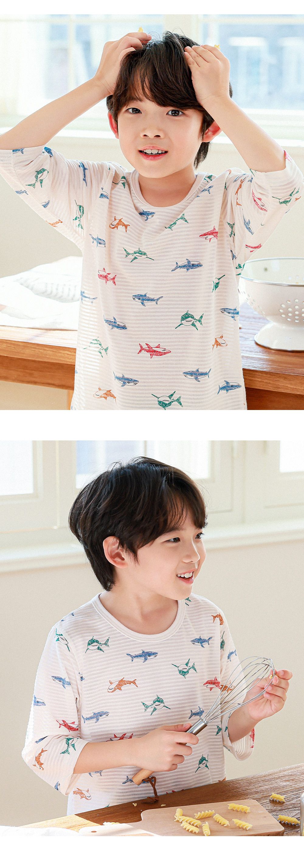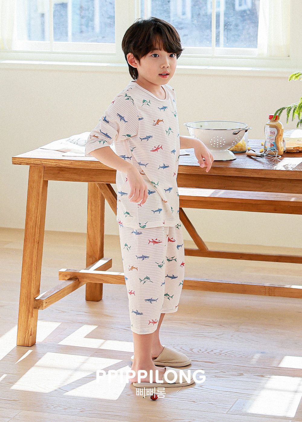 韓國 Ppippilong - 舒透提花7分袖家居服/睡衣-塗鴉鯊魚-米