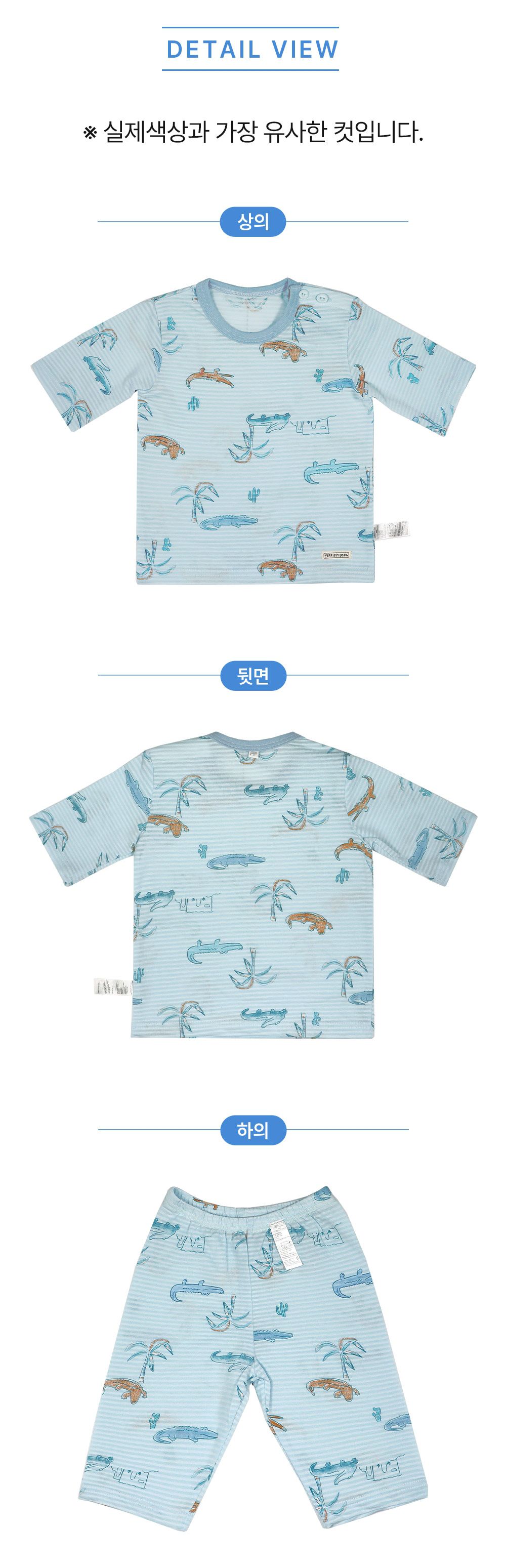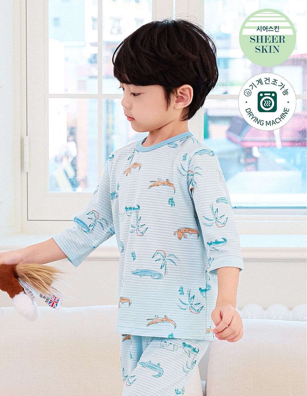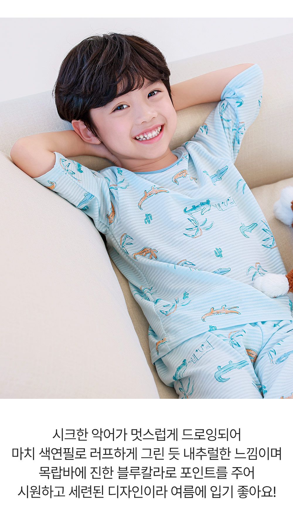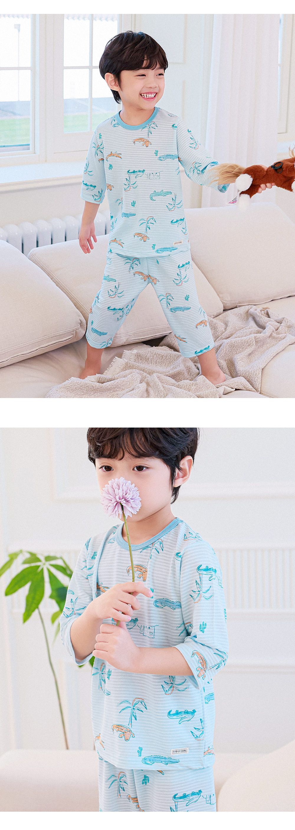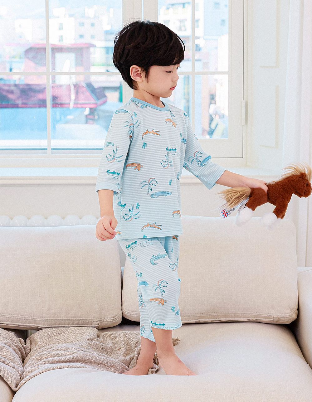韓國 Ppippilong - 舒透提花7分袖家居服/睡衣-塗鴉鱷魚-水藍