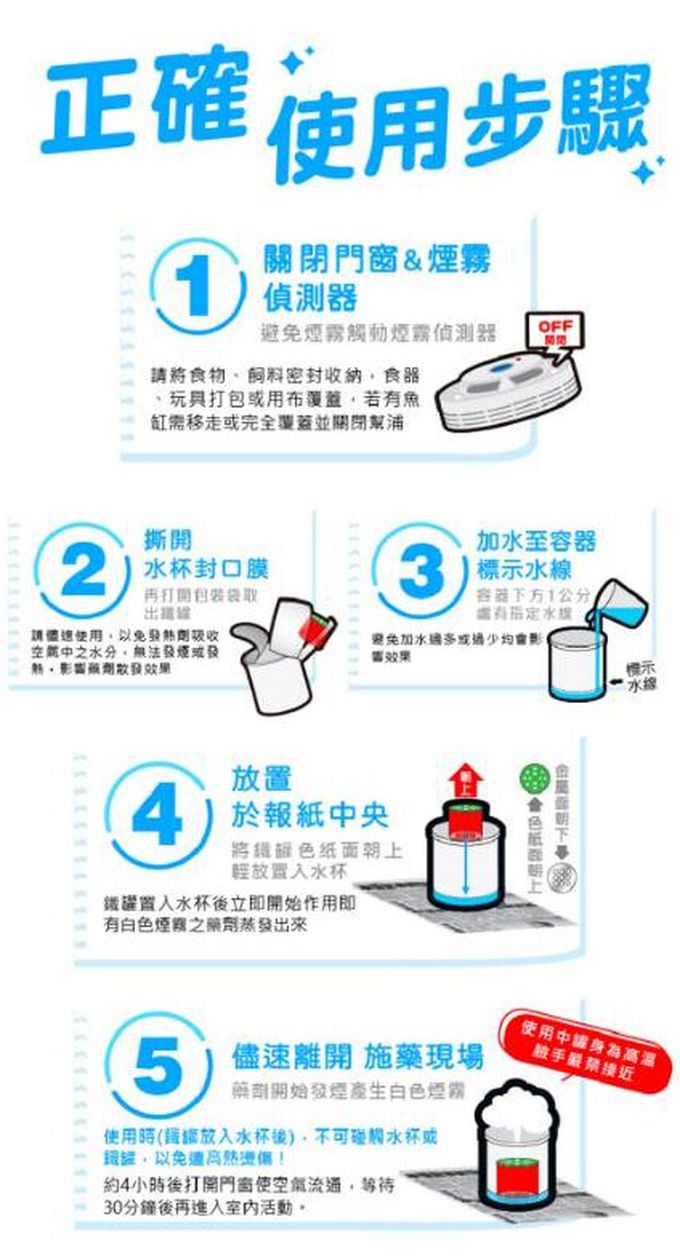 注意事項:使用及儲藏時應注意事項 1.使用前請將食物、食器、玩具、飼料覆蓋,特別是魚缸(本劑對水生生物毒性高)須完全覆蓋,並關閉幫浦。 2.使用前請關閉煙霧偵測器或以保鮮膜覆蓋,以避免火災警報器發報。 3.撕開密封包裝袋應儘速使用,否則發熱劑會吸收空氣中之水分,導致無法發煙或發熱,影響藥劑散發效果。 4.藥劑蒸出前(鐵罐放入水杯後之30秒),不可碰觸水杯或鐵罐,且人、畜及寵物必須儘速離開(或移開)施藥現場,以免遭高熱燙傷或誤吸入藥劑引起身體不適。 5.使用中,罐身為高溫,請勿將四肢及臉部置於距水杯上方50公分四周圍內,以免被燙傷。 6.請務必確保已將門窗四周之縫隙用報紙或布堵塞,避免藥劑煙霧逸出導致誤報火災。 7.經過2~4小時後重返施藥場所,應先打開門窗使空氣流通,至少等待30分鐘後再進入室內活動,開啟煙霧偵測劑或保鮮膜取下。 8.請保存於乾燥陰涼及孩童不易取得處。