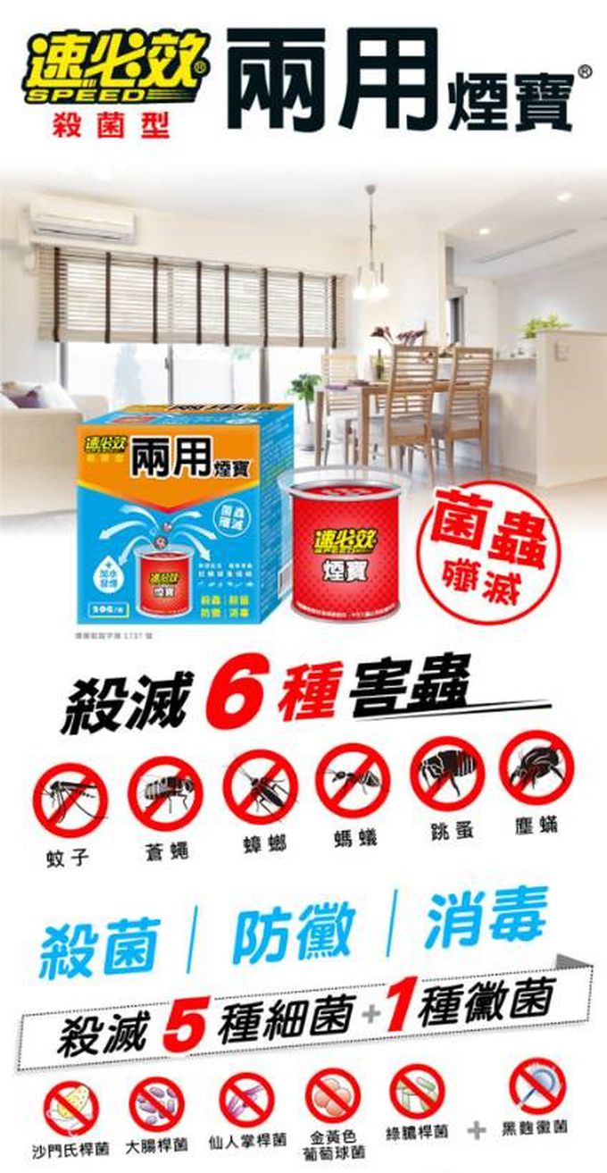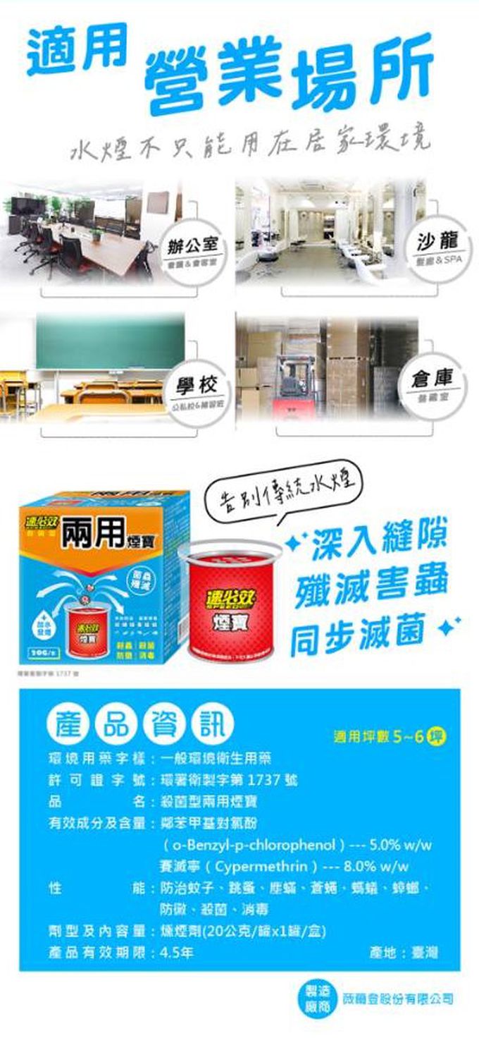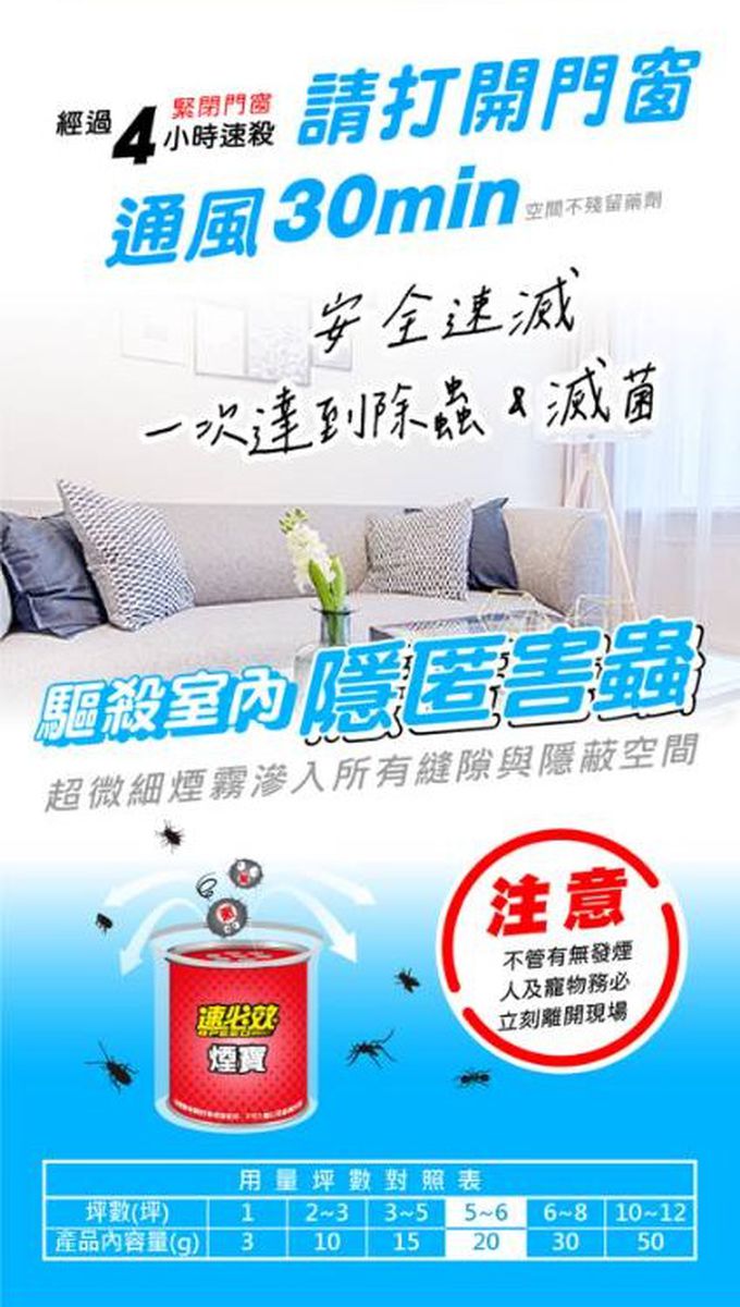 使用方式:適用範圍及使用方法 本品適用於公、私場所之室內環境。 1.本藥劑之使用量依下列對照表使用,若坪數相同但空間高度較高,建議使用較大內容量之藥劑: 2.使用前請關閉門窗,並將櫥櫃、抽屜等全都打開,效果更佳。 3.撕開水杯容器上方之封口膜後,再打開包裝袋取出鐵罐,並加水至容器下方1公分處的指定水線,水過多過少均會影響效果。 4.將鐵罐正面(色紙面)朝上,並將鐵罐底部(金屬面)浸入水中約30~90秒後,即有白色煙霧之藥劑開始蒸發出來。 5.使用時,請緊閉門窗4小時,待藥劑揮散後再進入施藥場所。