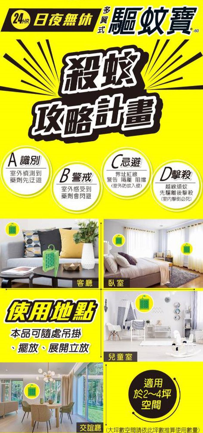 使用方式:適用範圍及使用方法 本品適用於公、私場所之室內外周圍環境。 1.直接將本品吊掛或放置於蚊子易出沒之處,例如:陽臺、玄關、紗窗門內、外出入口處。 2.開封後每片約可使用60天。