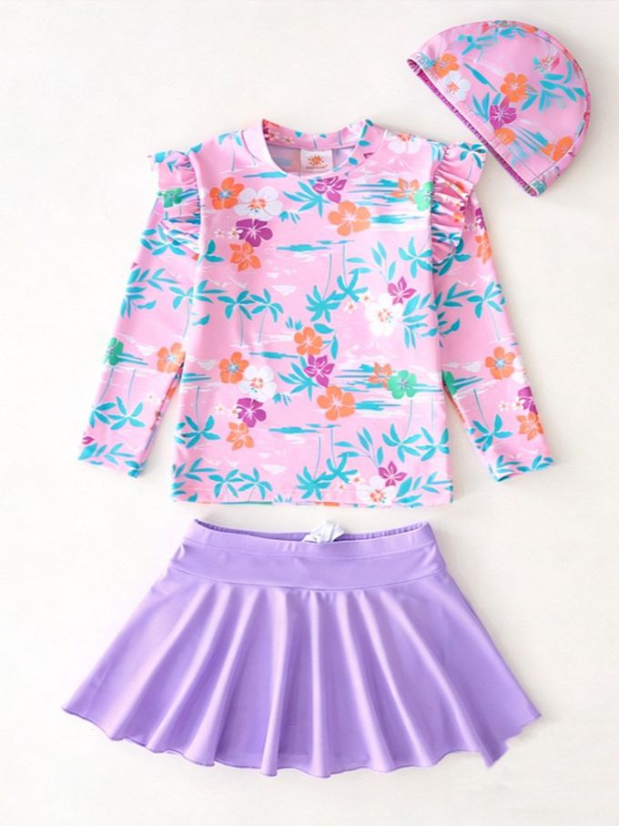 女寶防曬長袖泳裝套裝(附帽子)-裙款_甜美花朵-粉紫