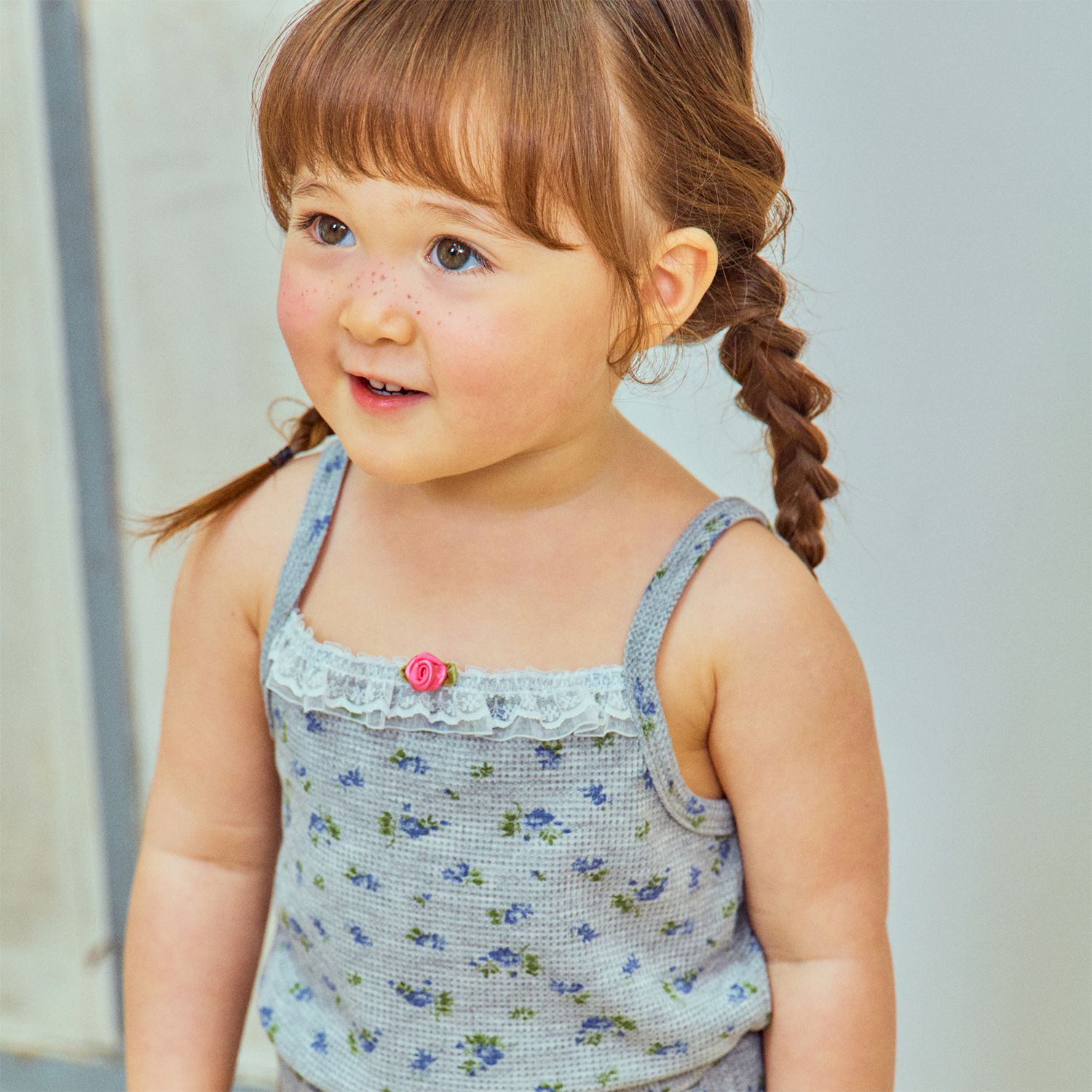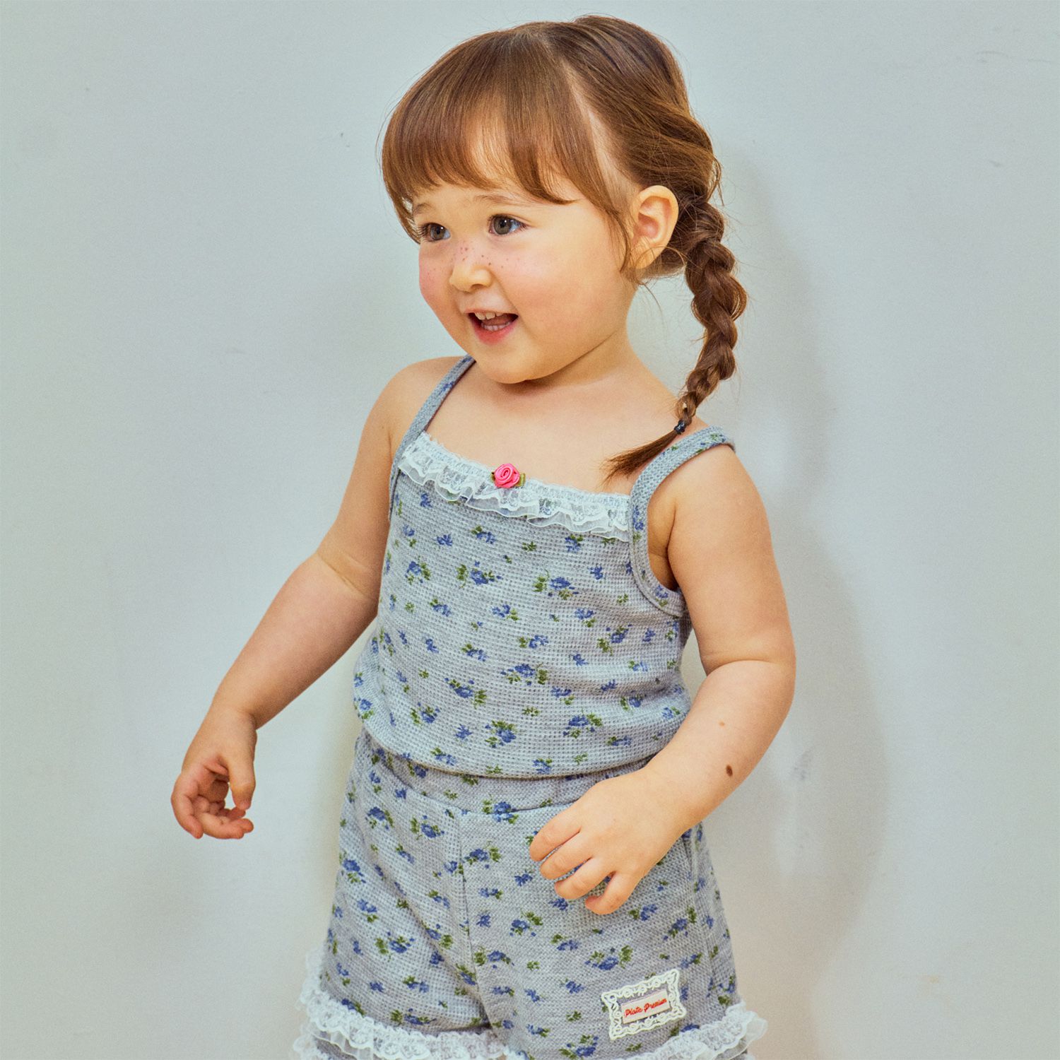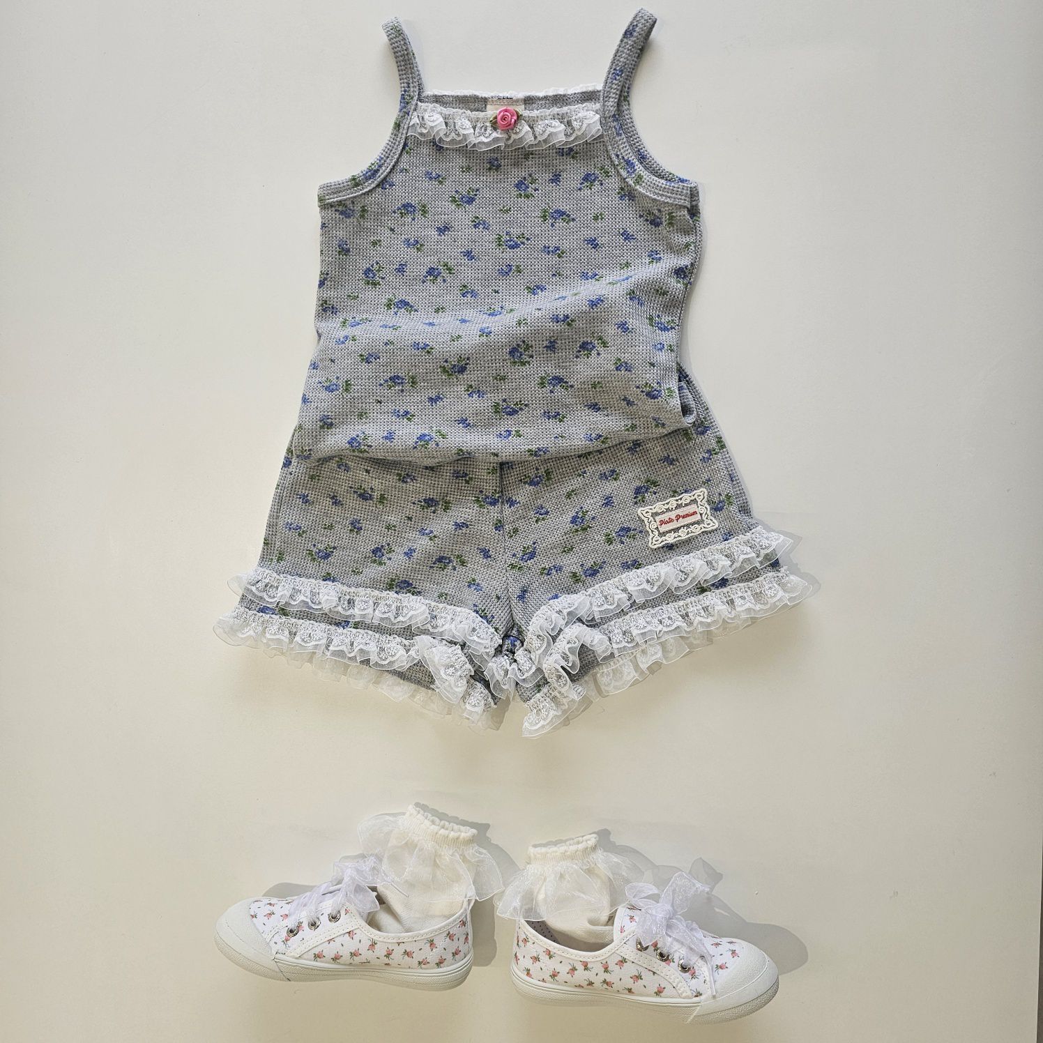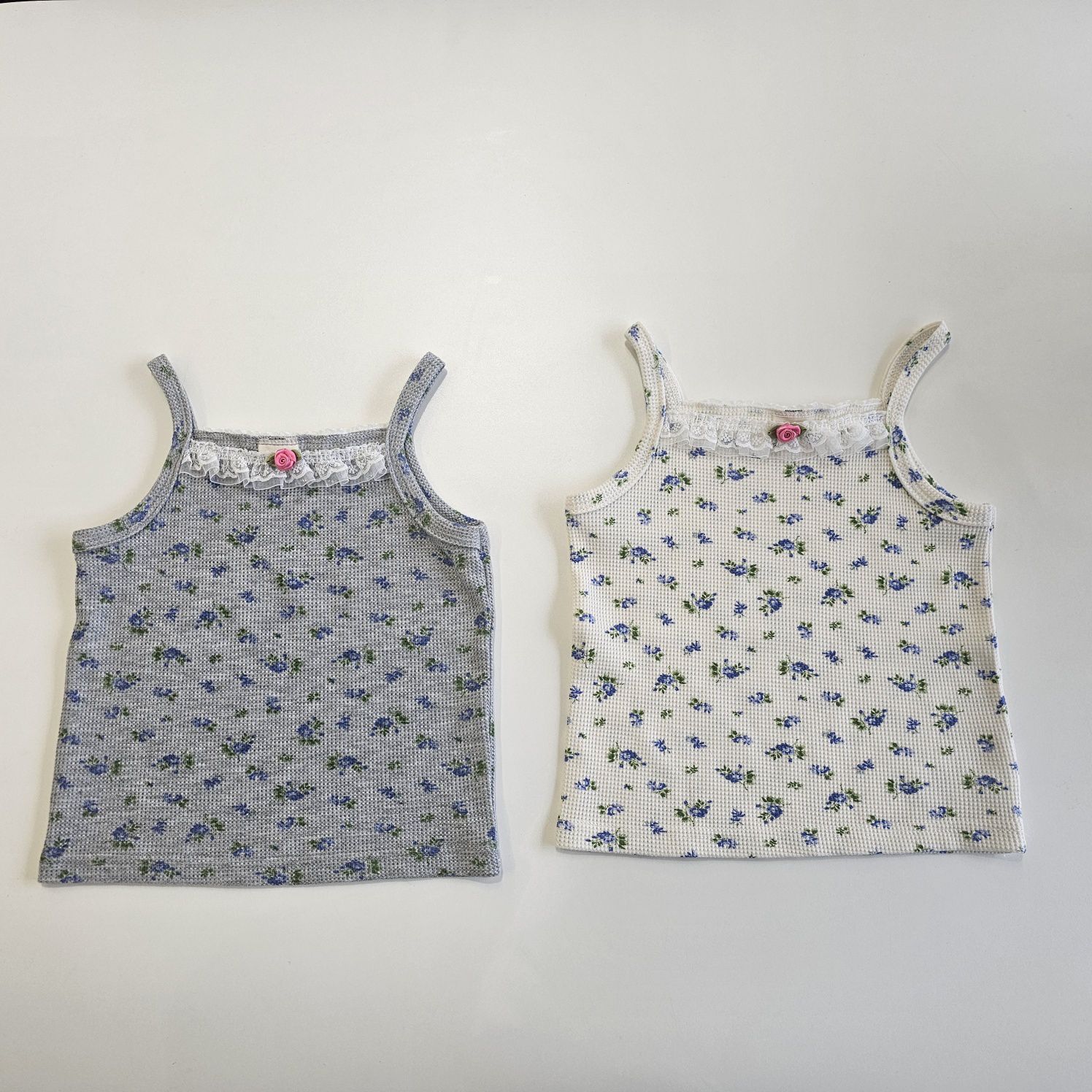 韓國 First Blue - 藍花束鬆餅紋細肩帶上衣-灰