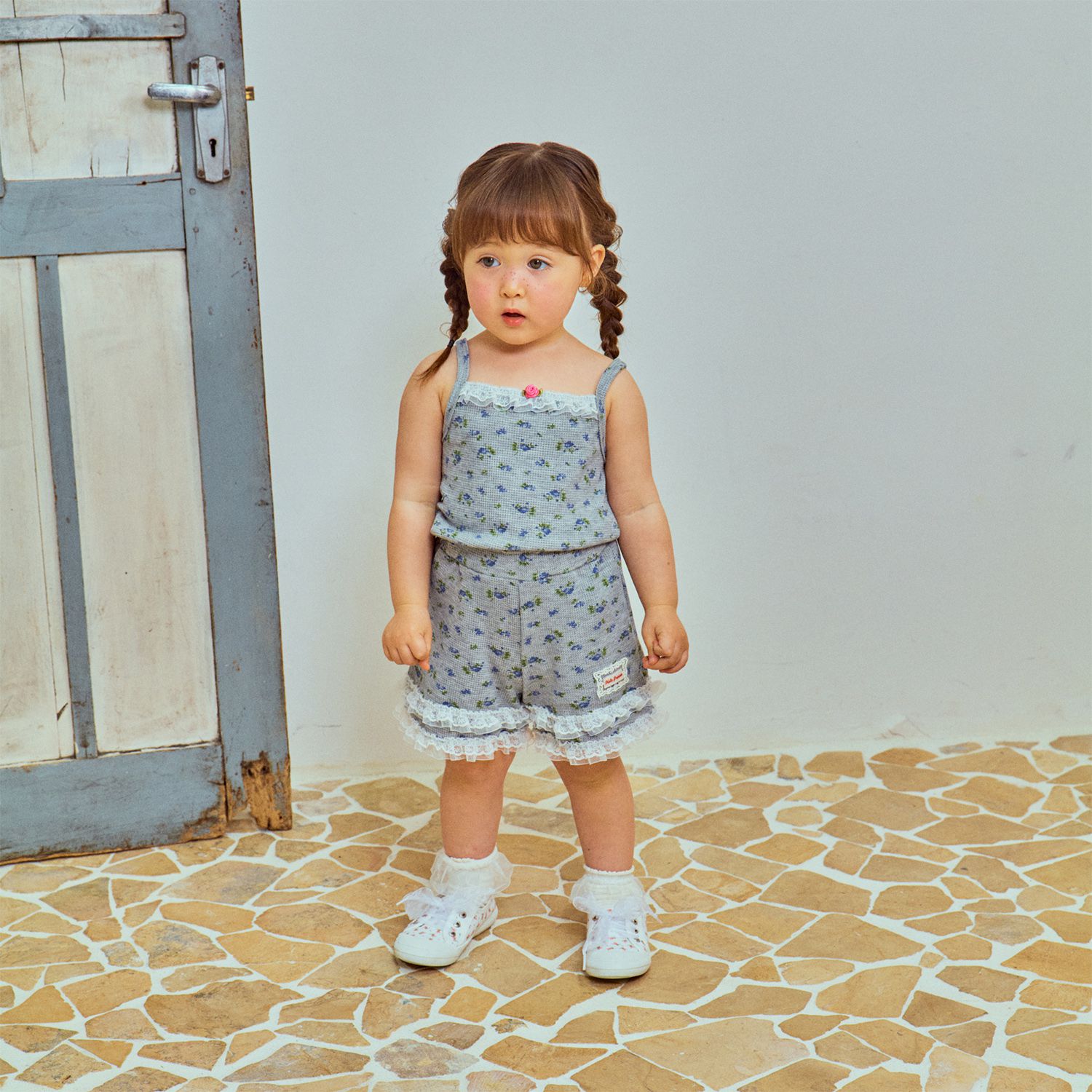 韓國 First Blue - 藍花束鬆餅紋細肩帶上衣