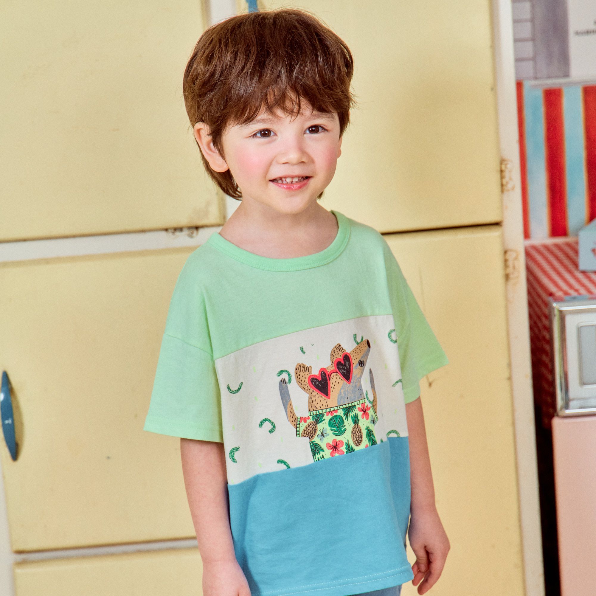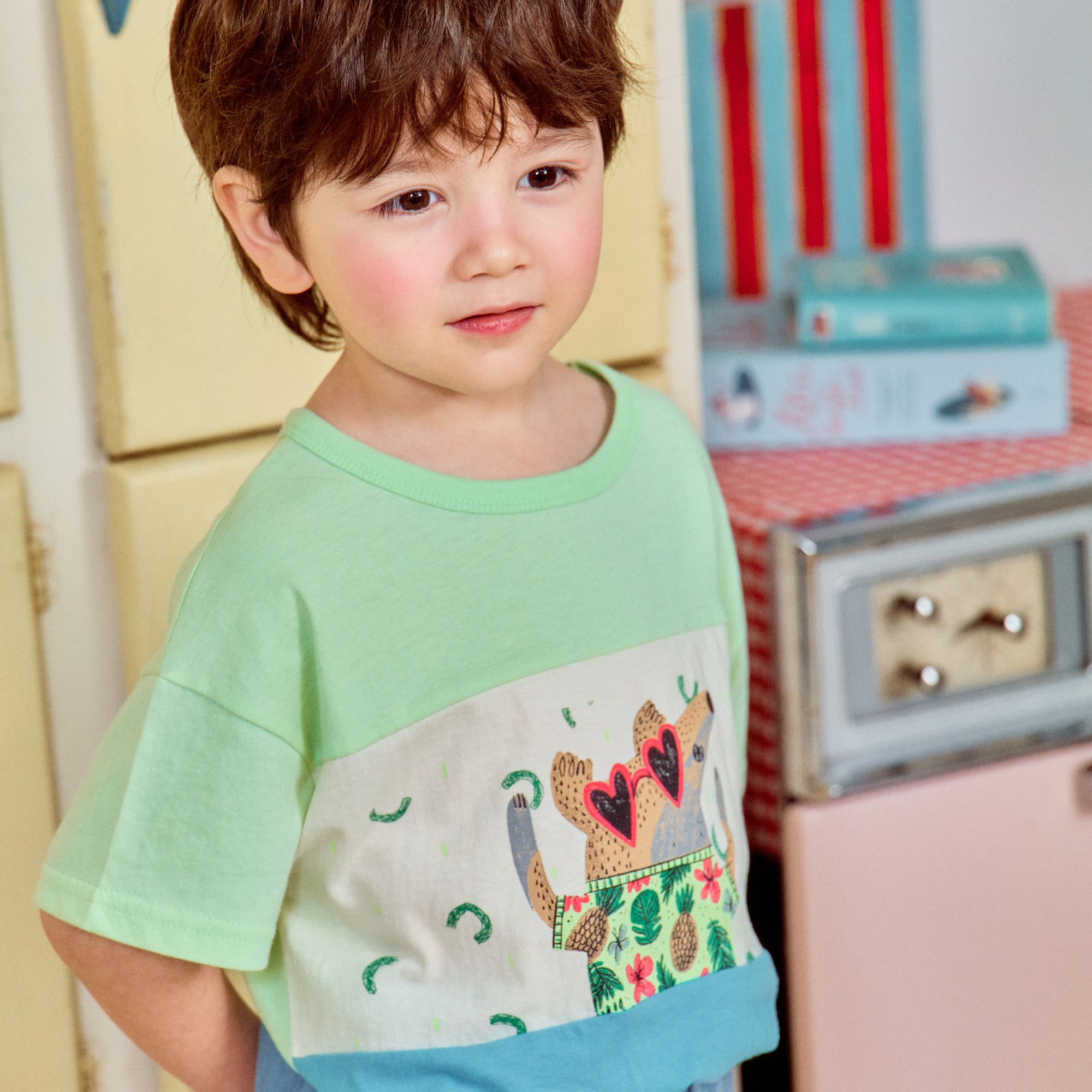 韓國 First Blue - 渡假動物拼色短袖上衣-淺綠X水藍