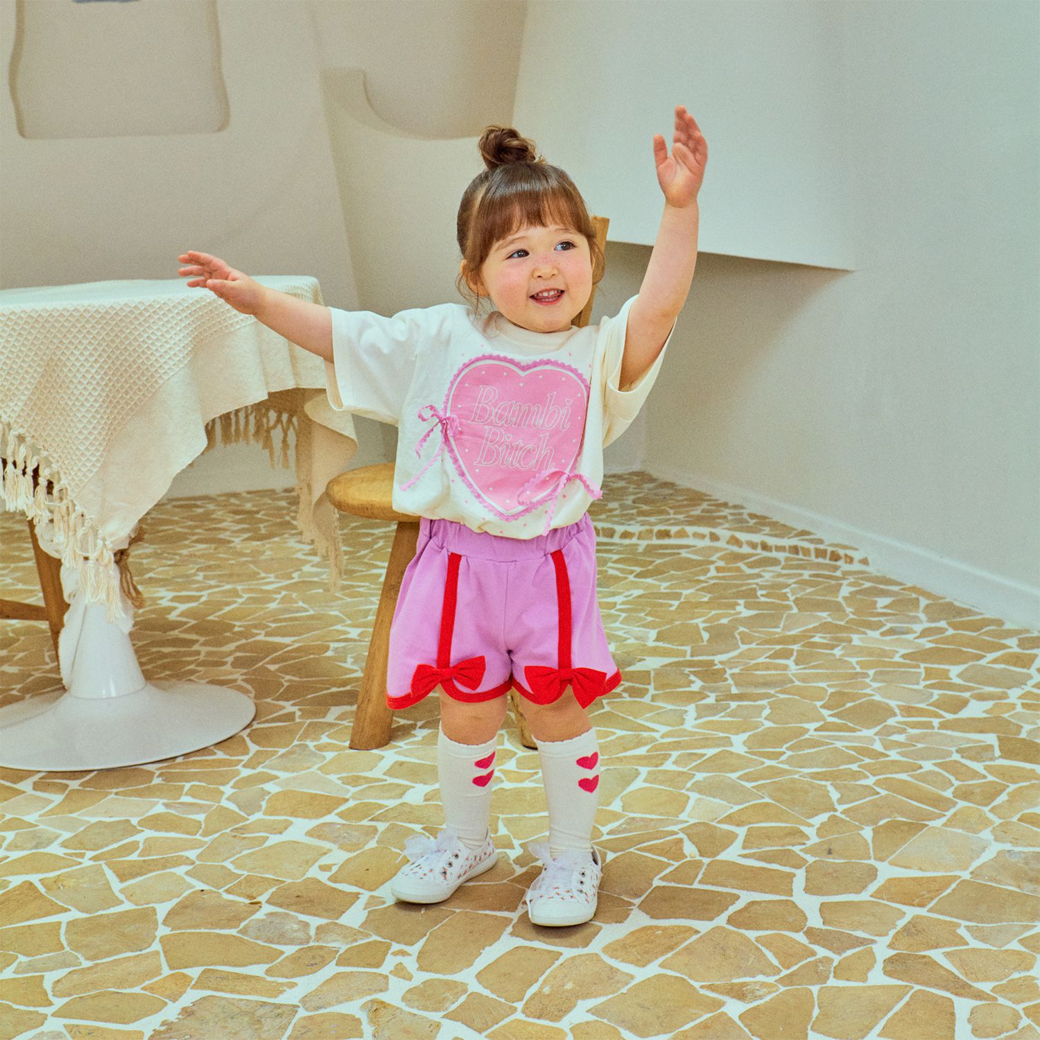 韓國 First Blue - 大裝飾蕾絲愛心短袖上衣-米
