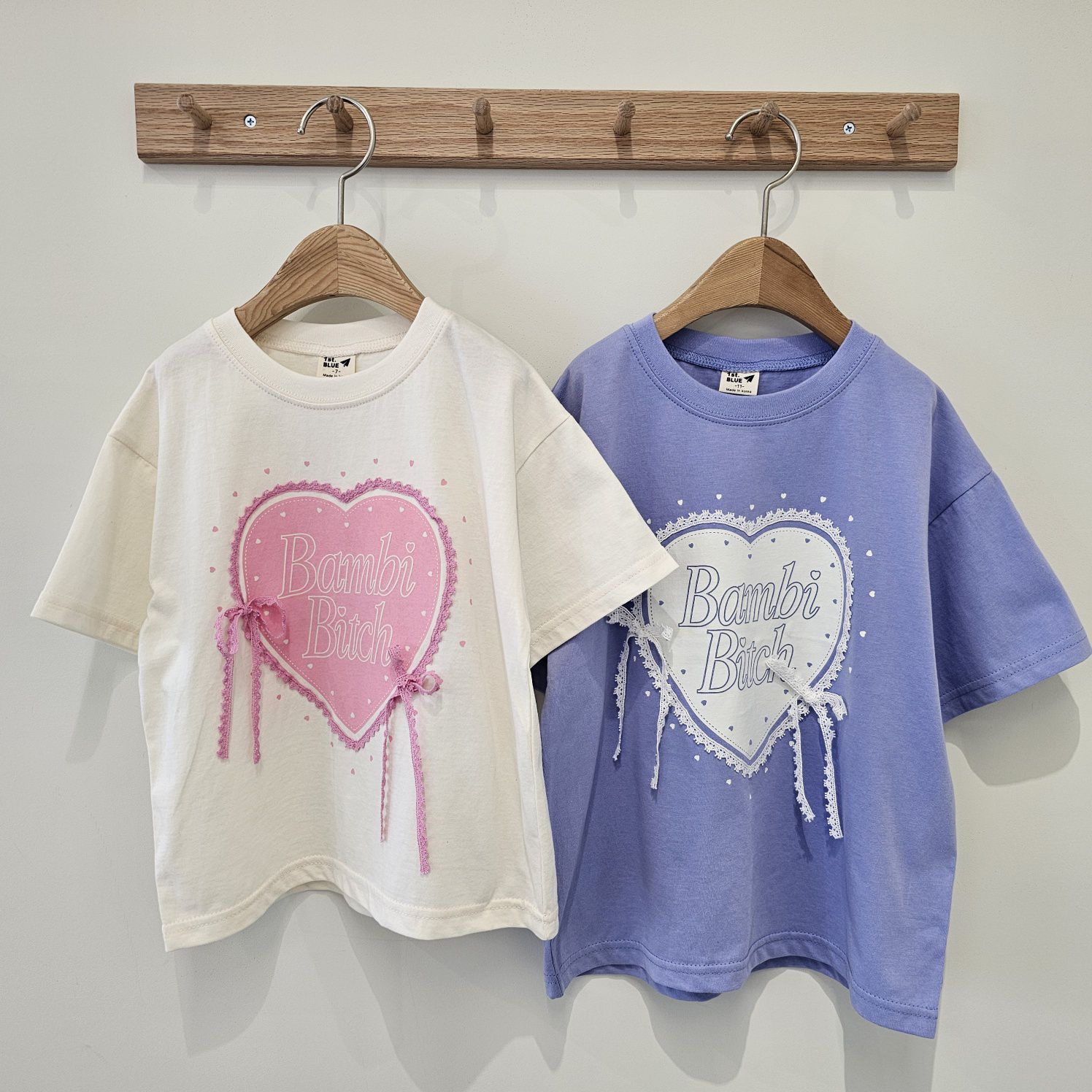 韓國 First Blue - 大裝飾蕾絲愛心短袖上衣
