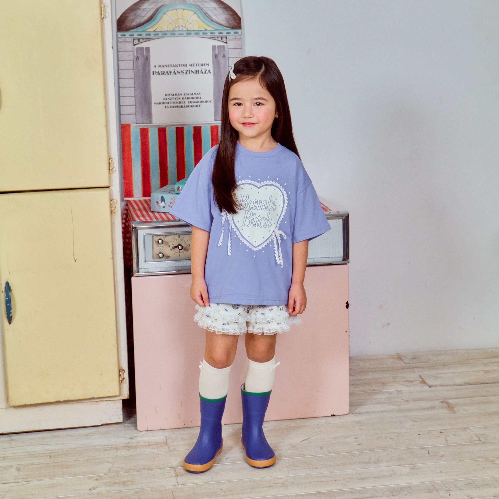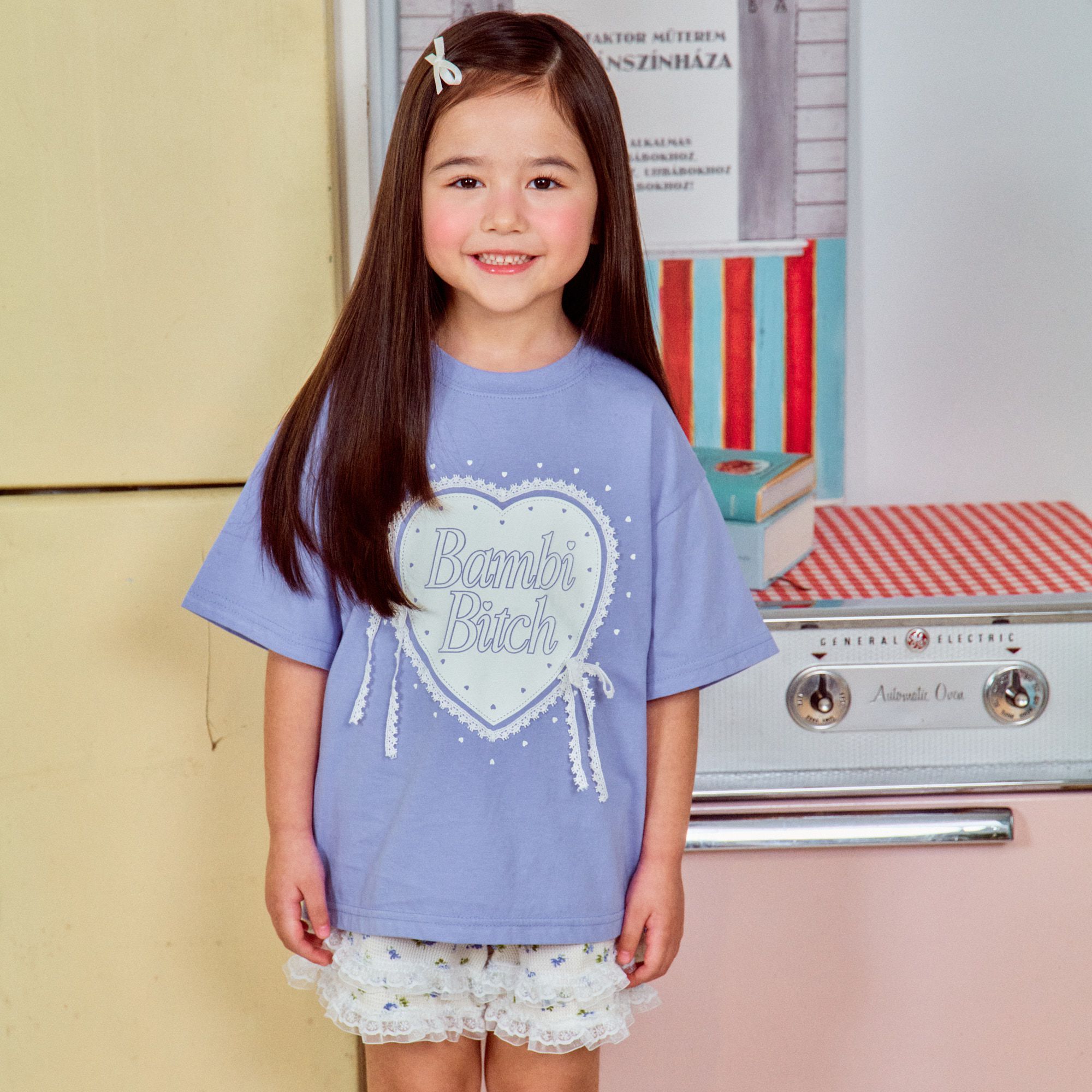 韓國 First Blue - 大裝飾蕾絲愛心短袖上衣-藍紫
