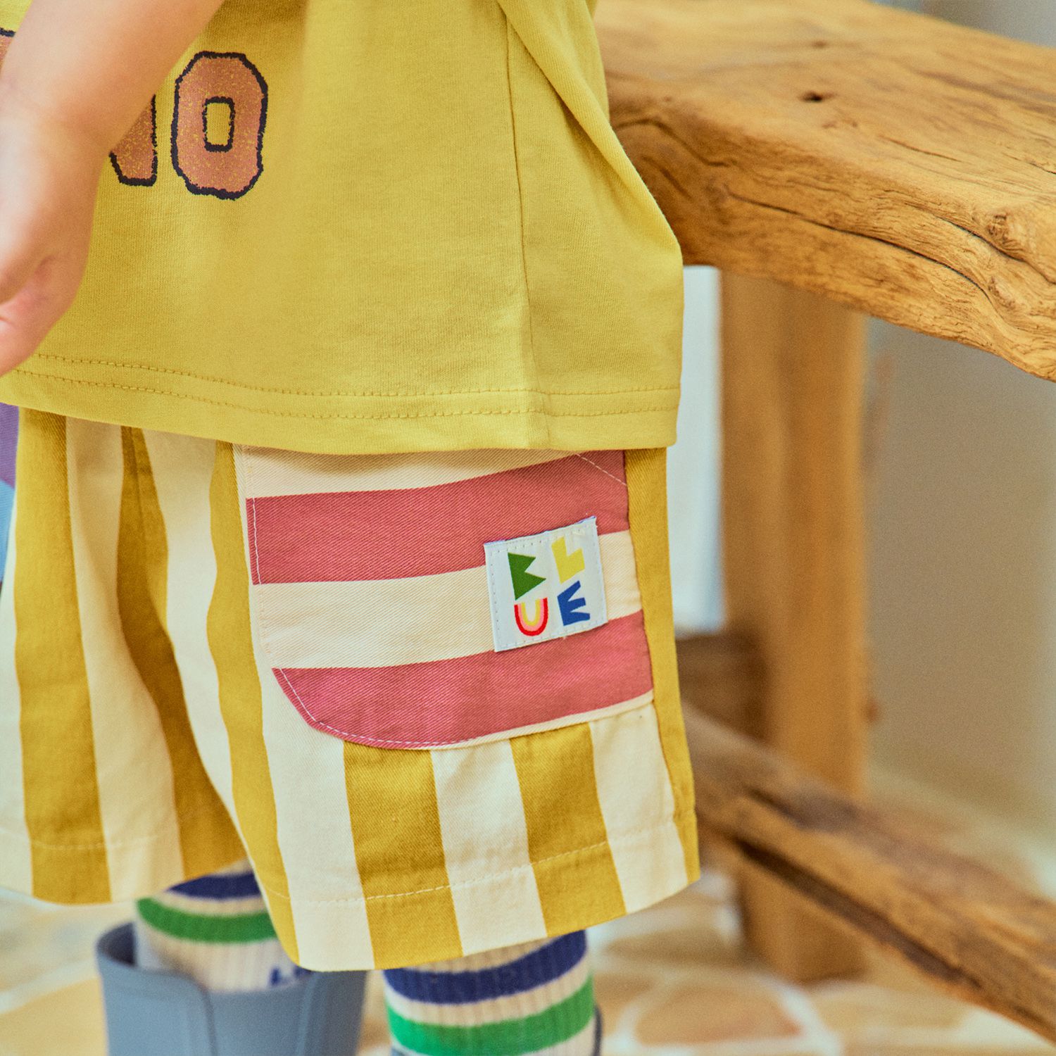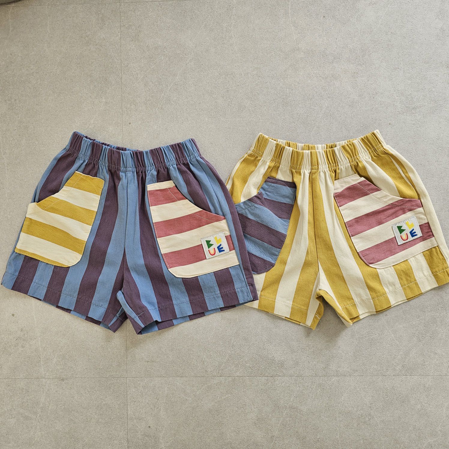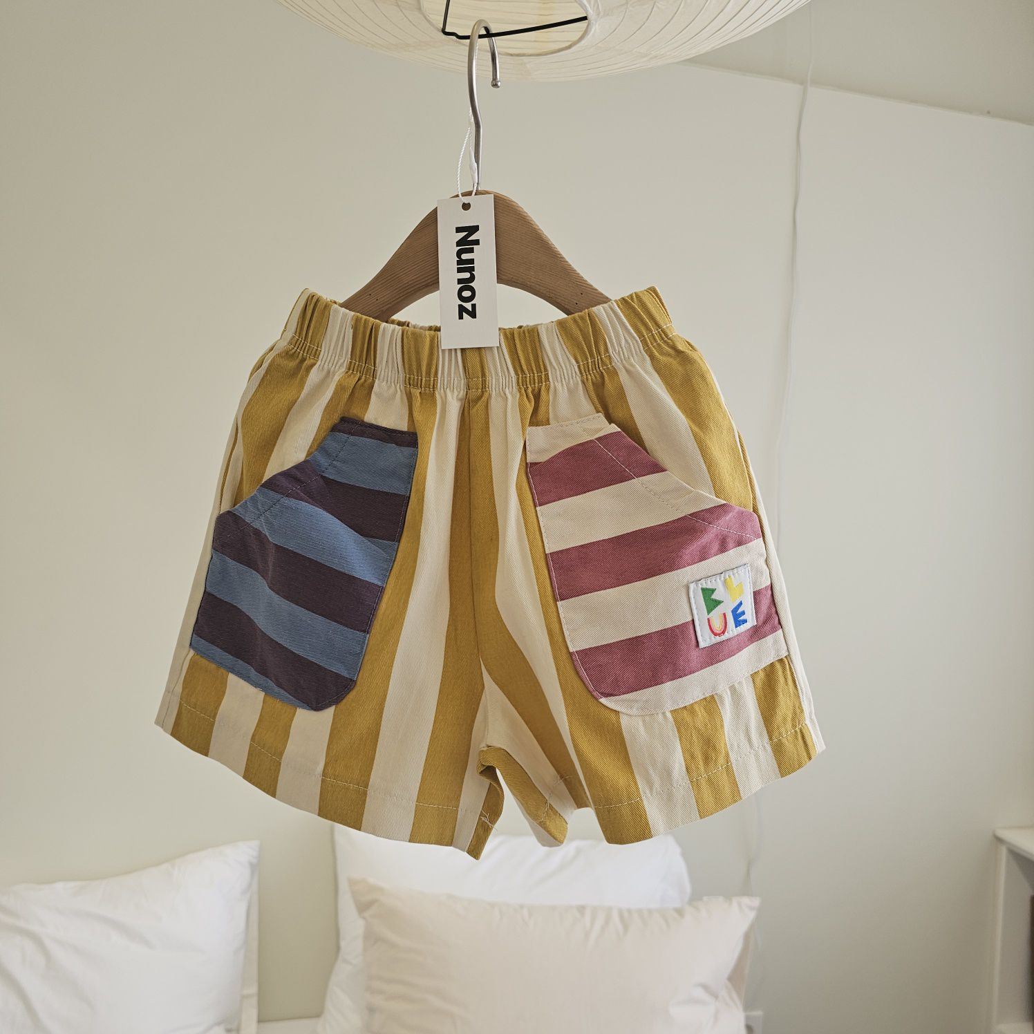 韓國 First Blue - 鬆緊腰撞色直紋短褲-芥黃X米