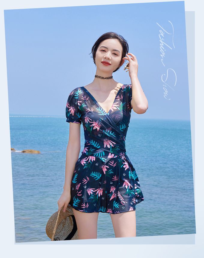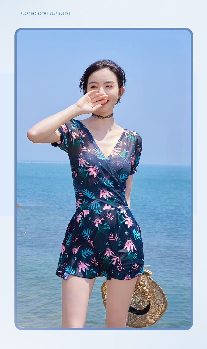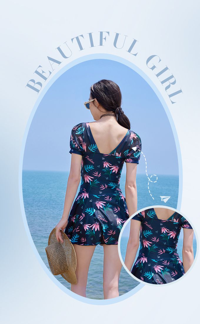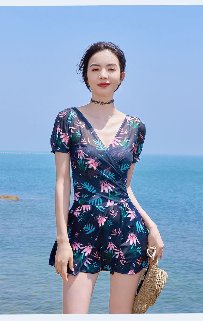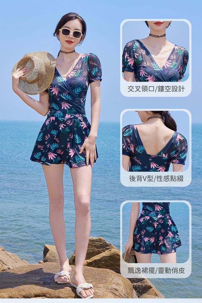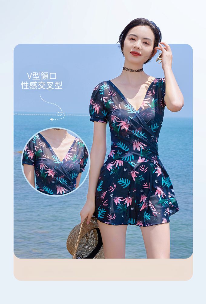 V領顯瘦小包袖連身裙泳衣-復古印花