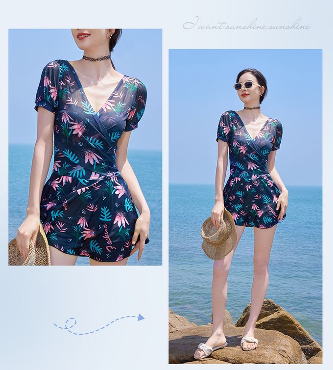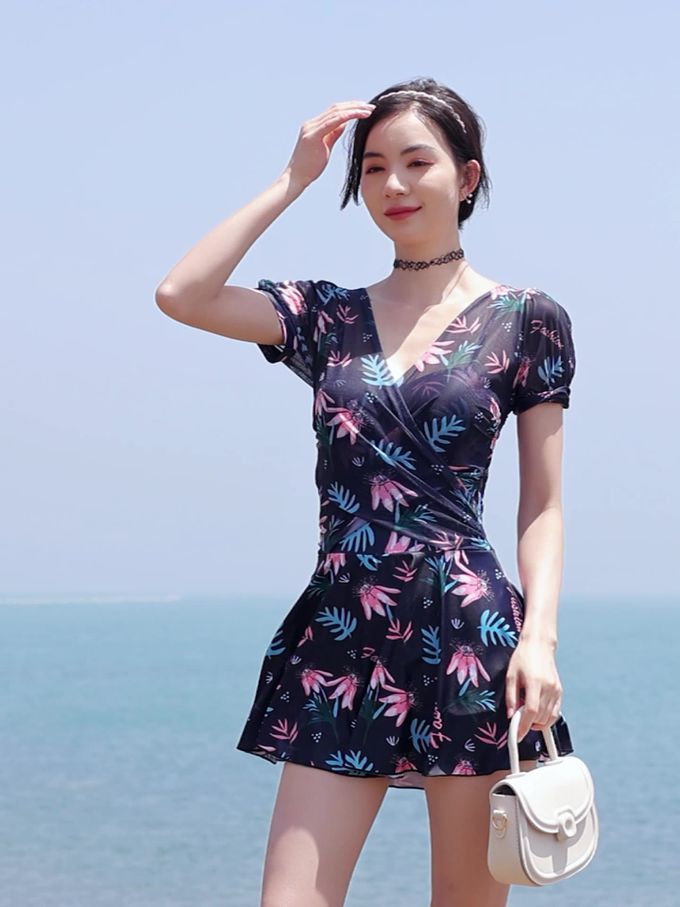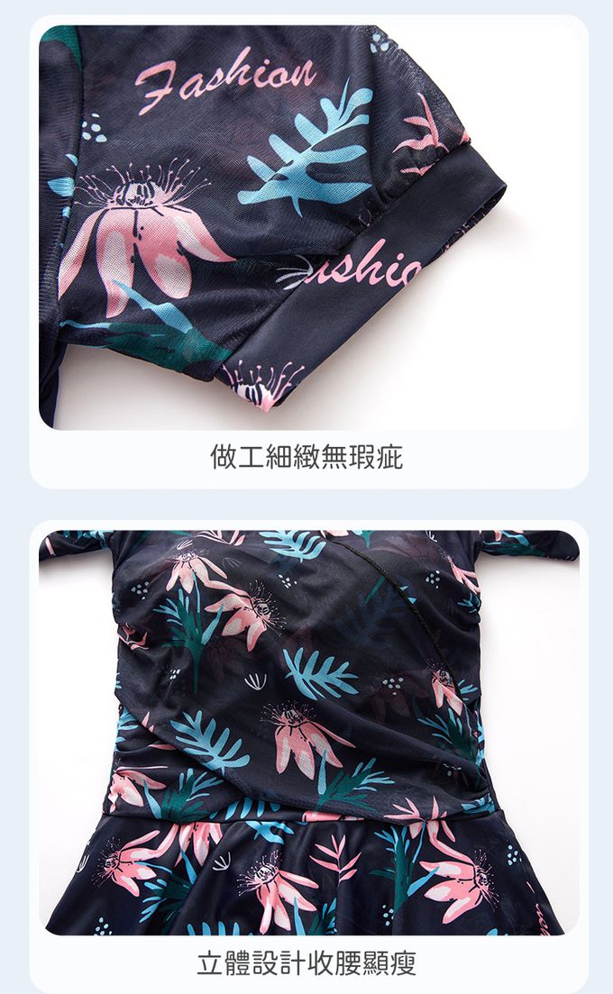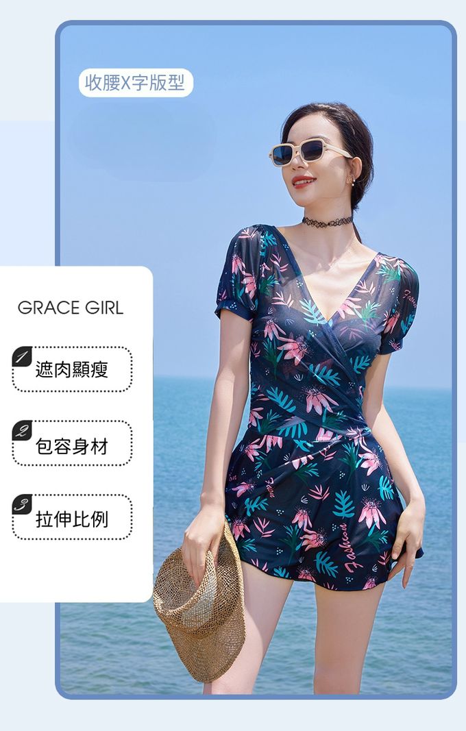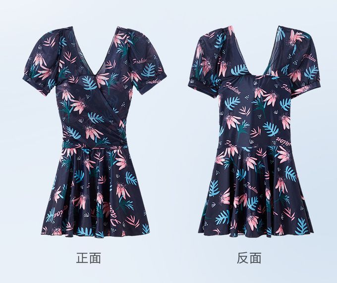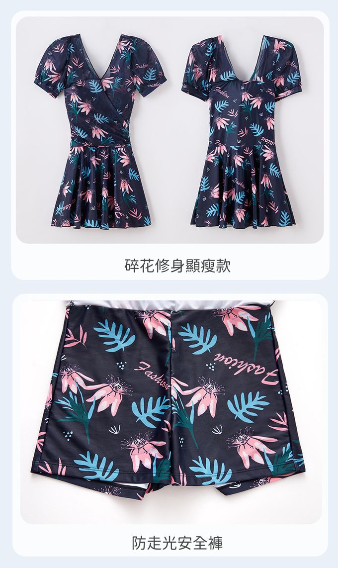 V領顯瘦小包袖連身裙泳衣-復古印花