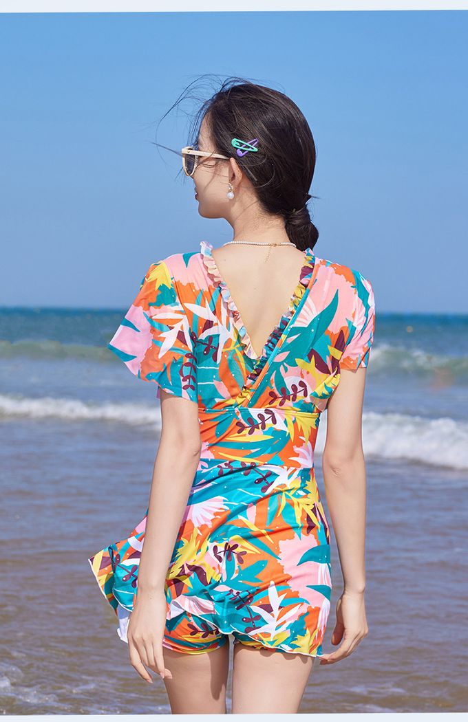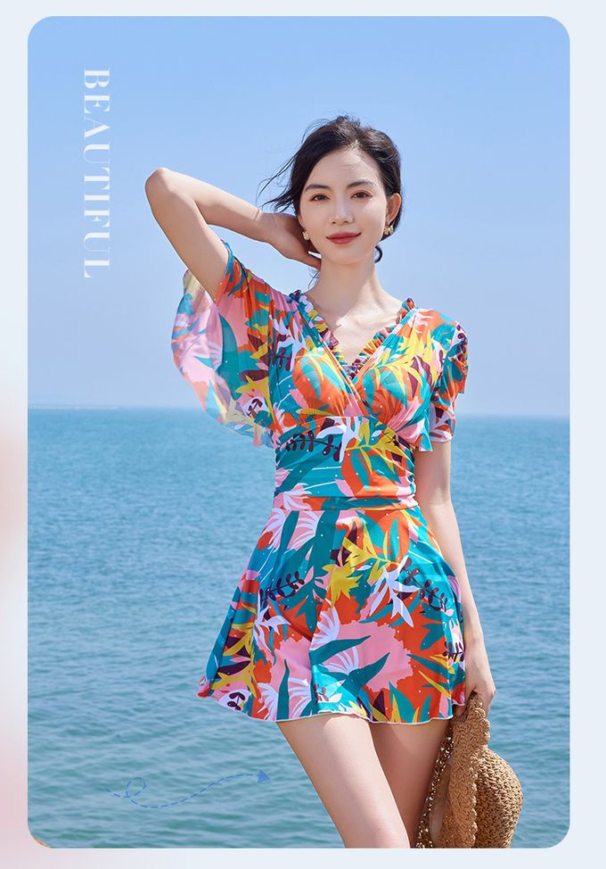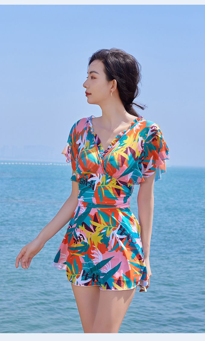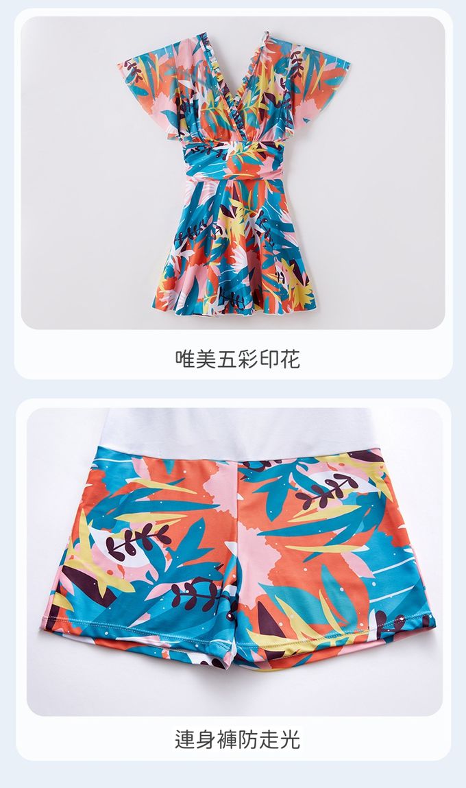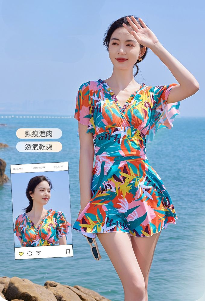 V領顯瘦小飛袖連身裙泳衣-五彩印花