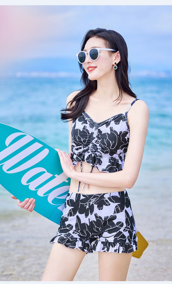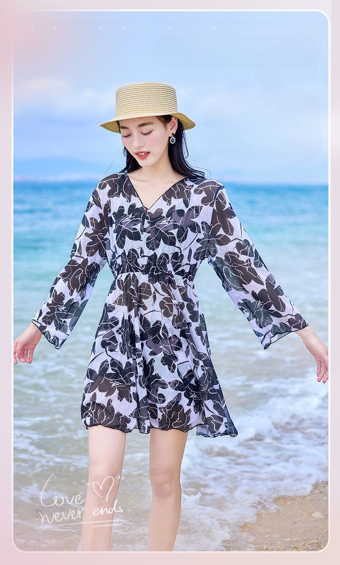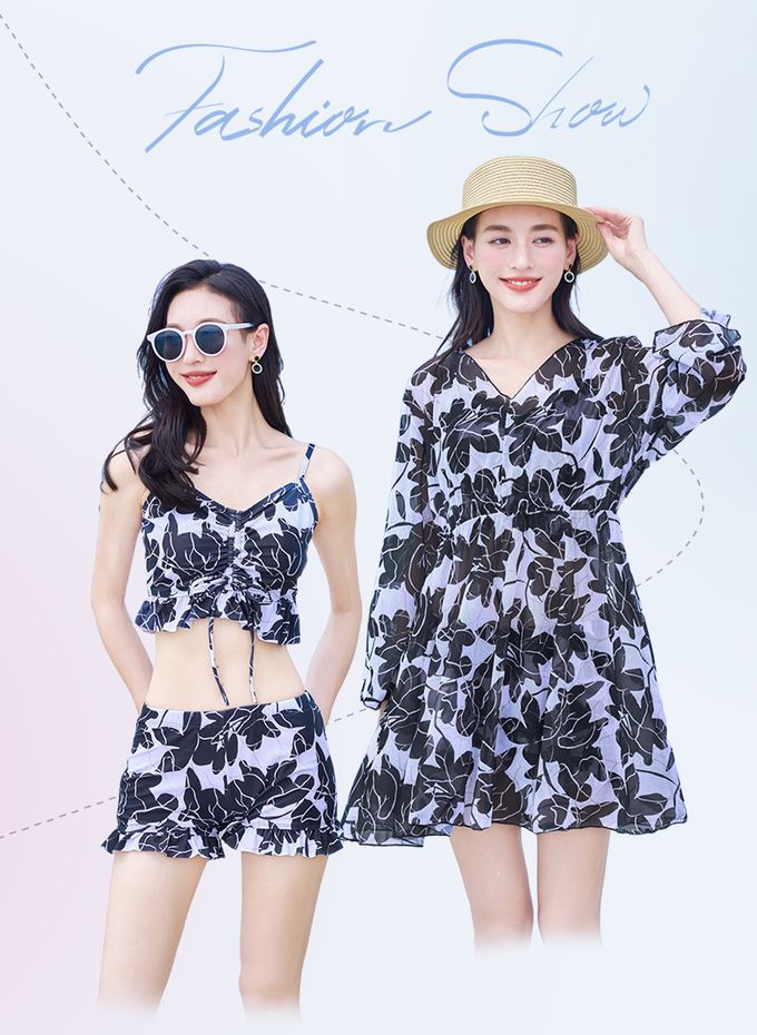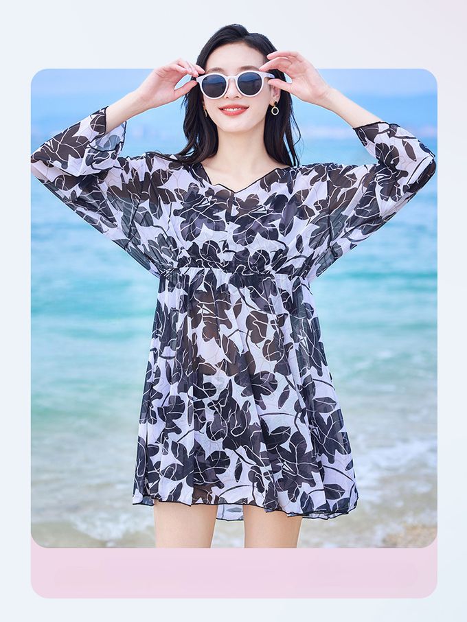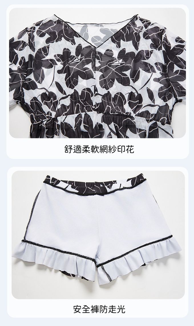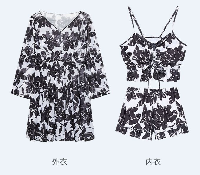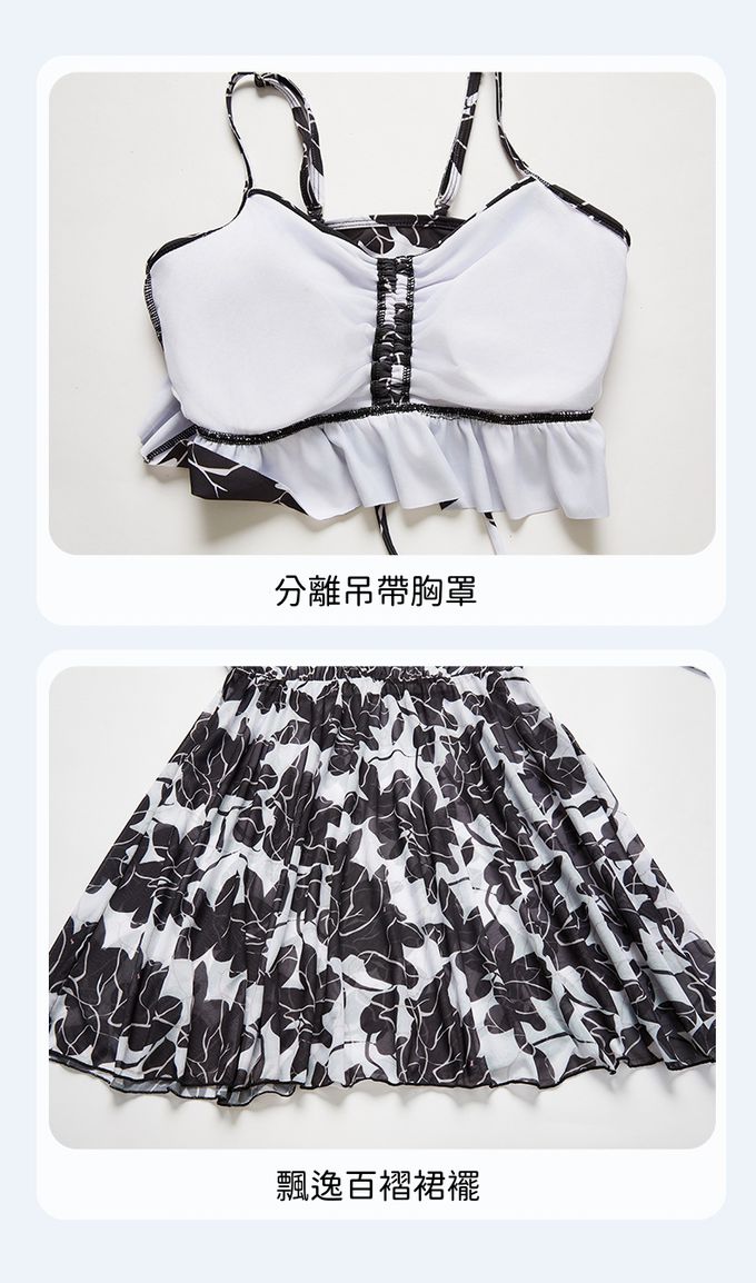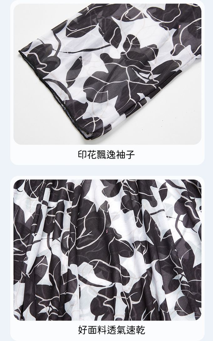 修身顯瘦遮肉連身裙泳衣(三件組)-黑白印花