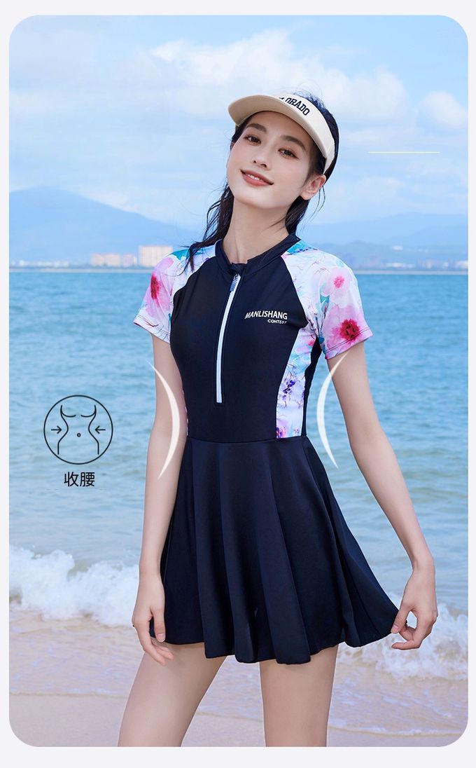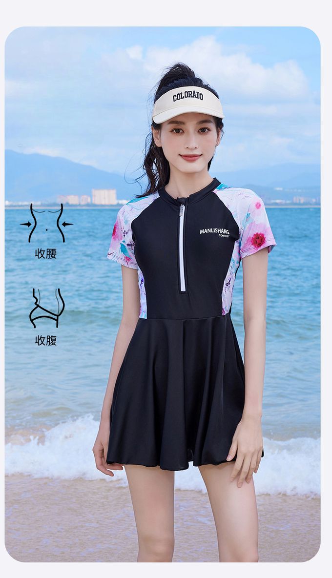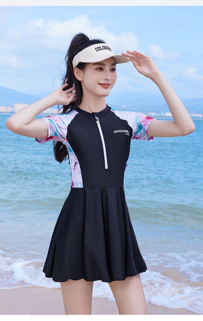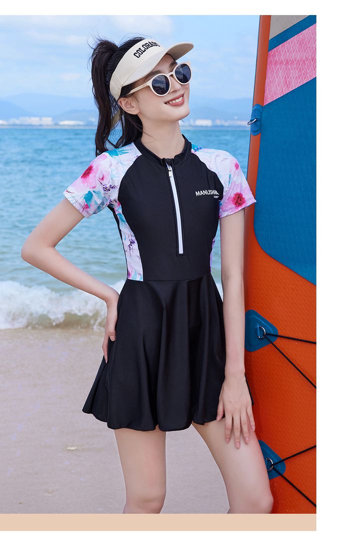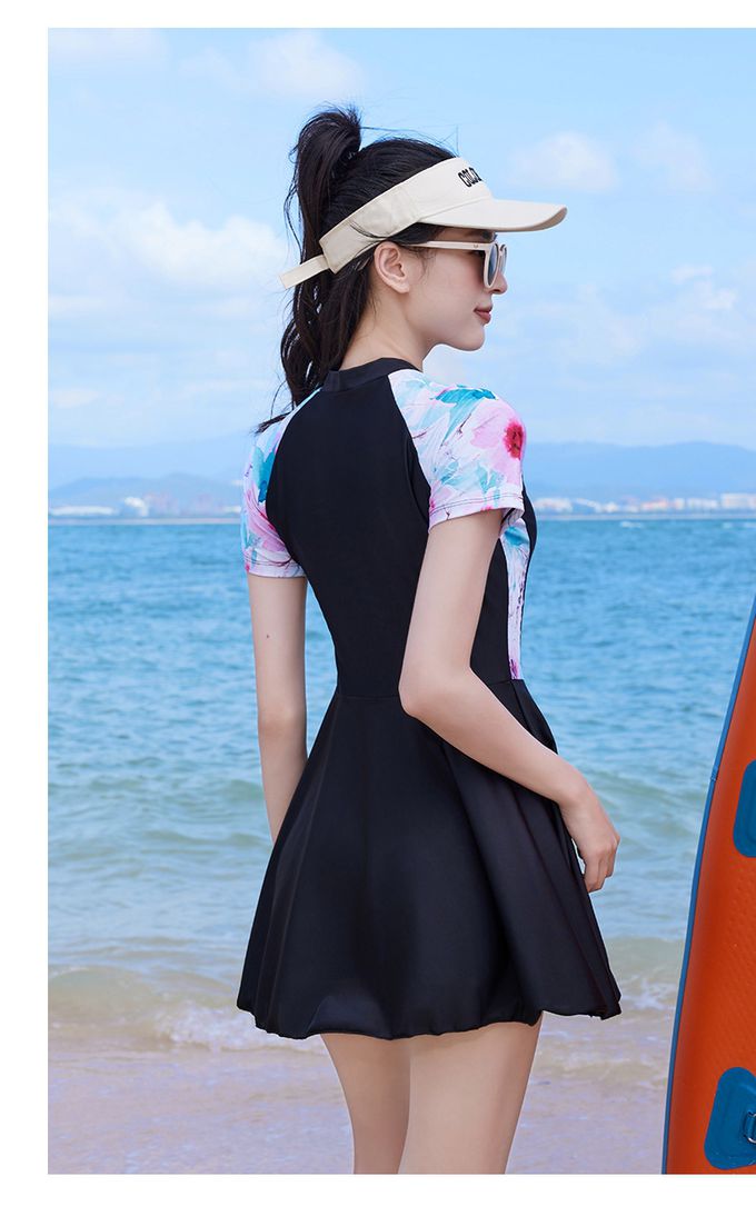 百搭修身顯瘦遮肉連身裙泳衣-花卉袖-黑色拼接