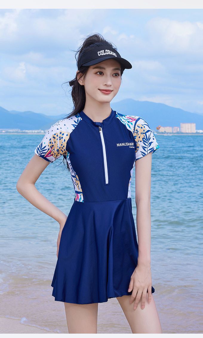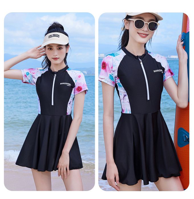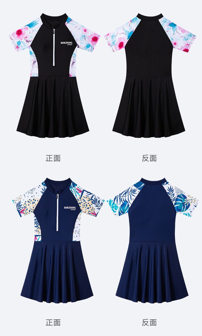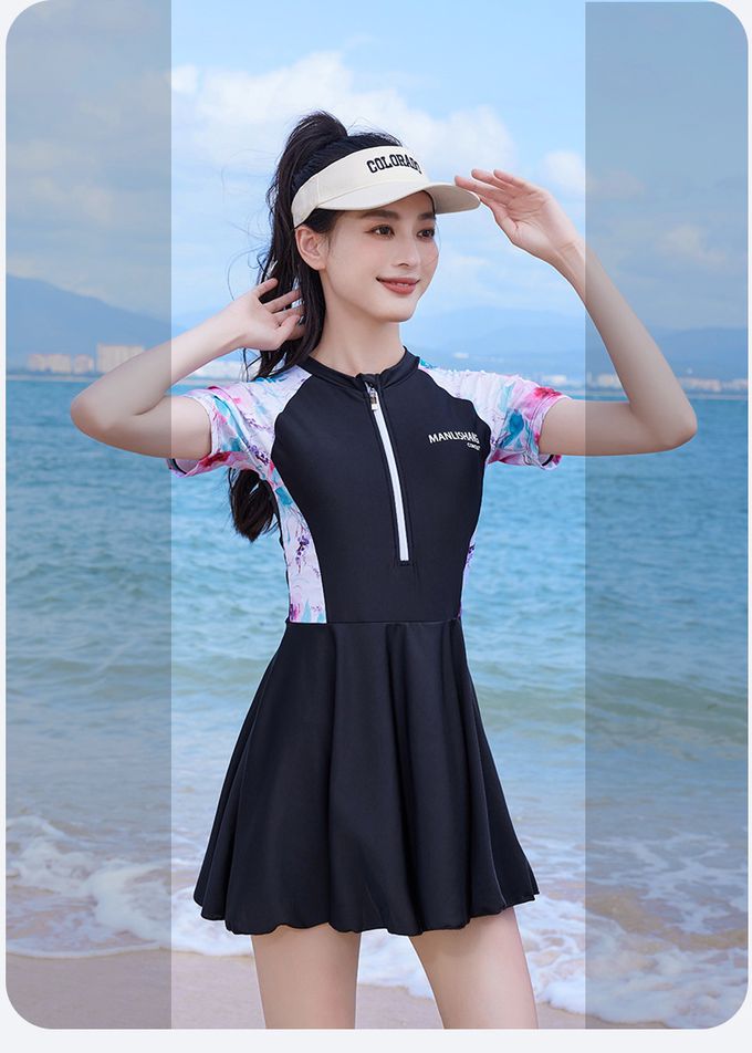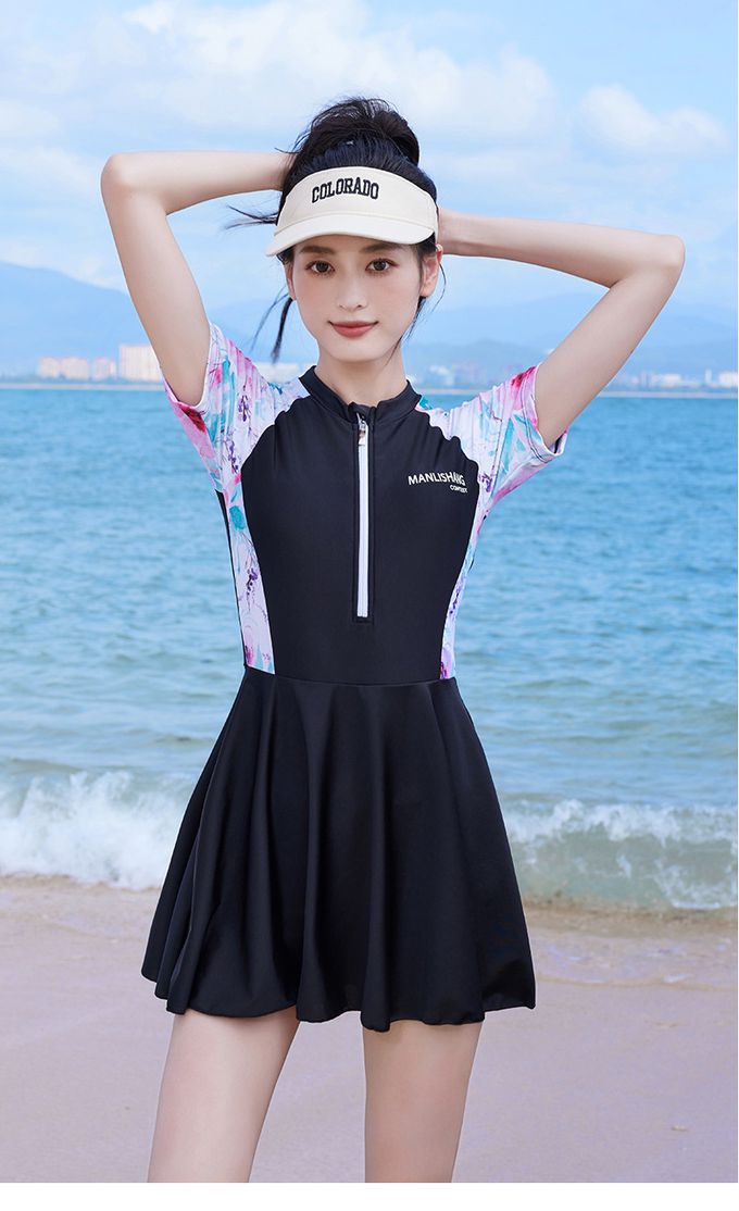 百搭修身顯瘦遮肉連身裙泳衣-花卉袖-黑色拼接