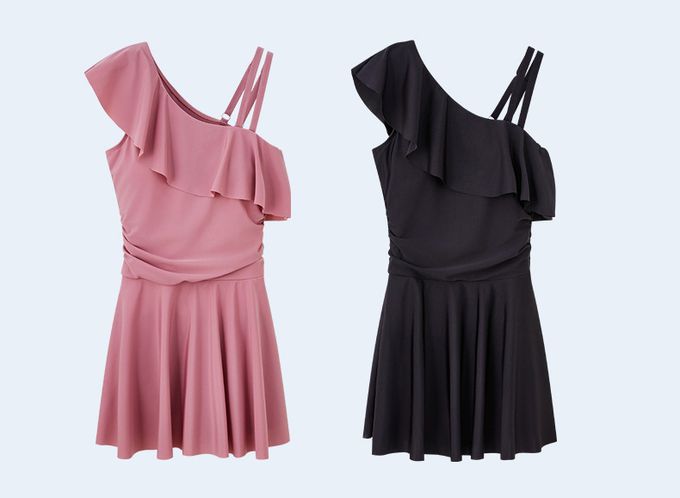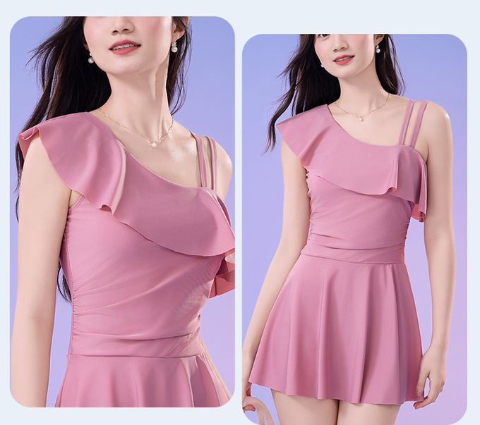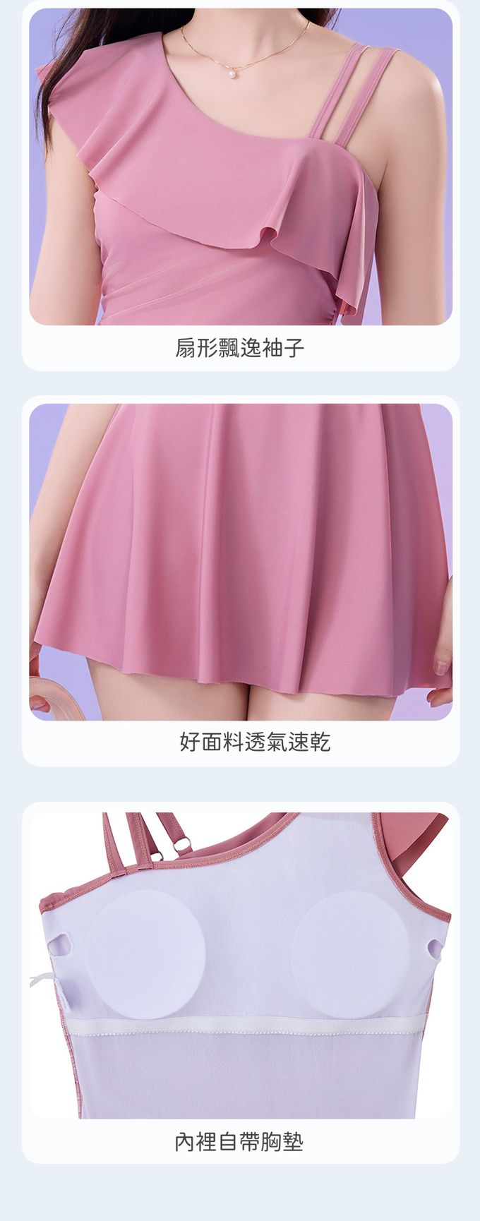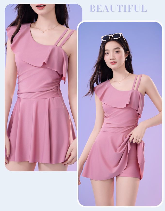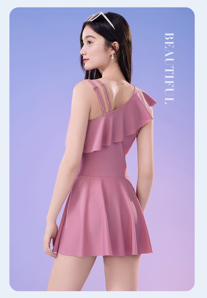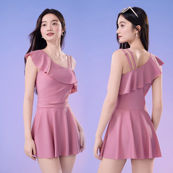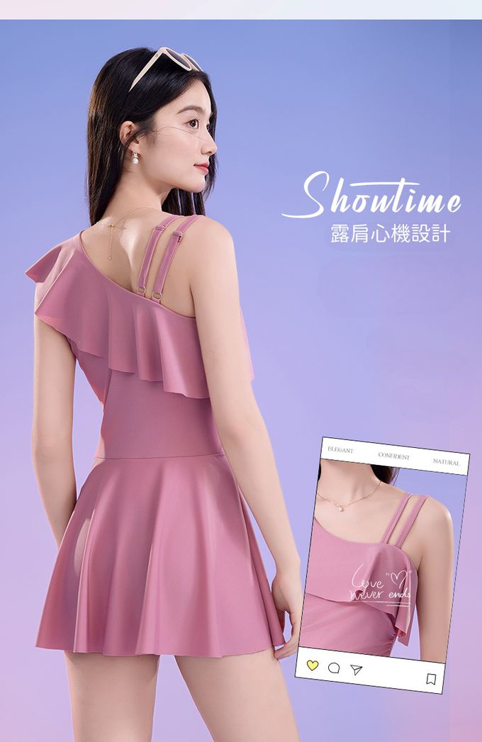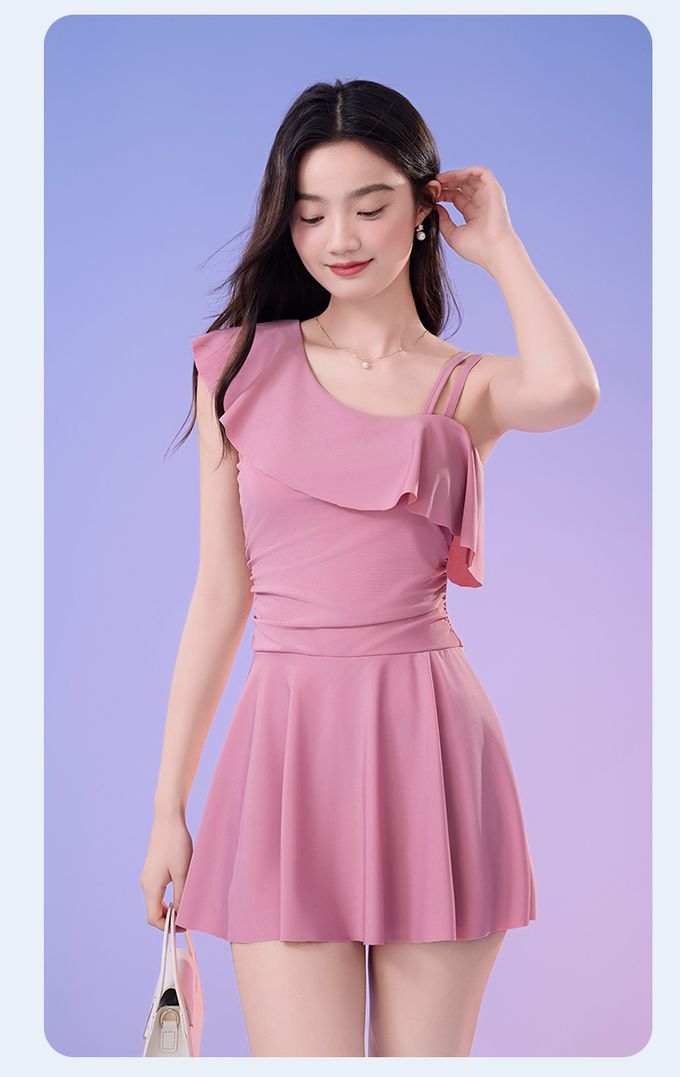 單肩設計修身顯瘦遮肉連身裙泳衣-甜美粉紫