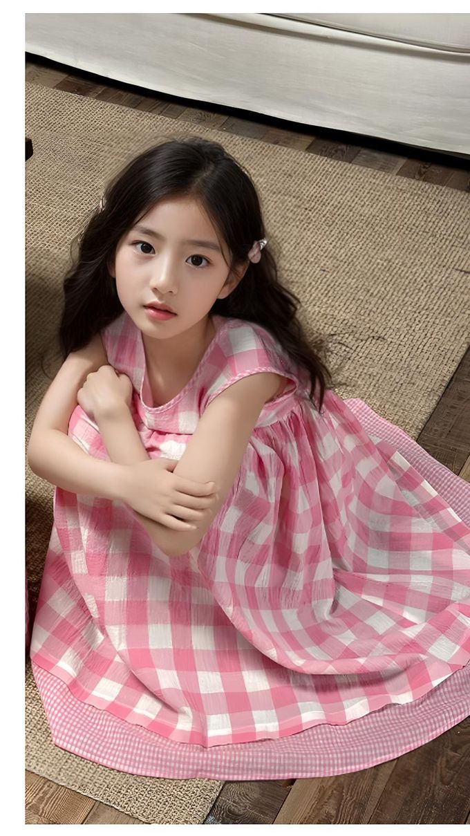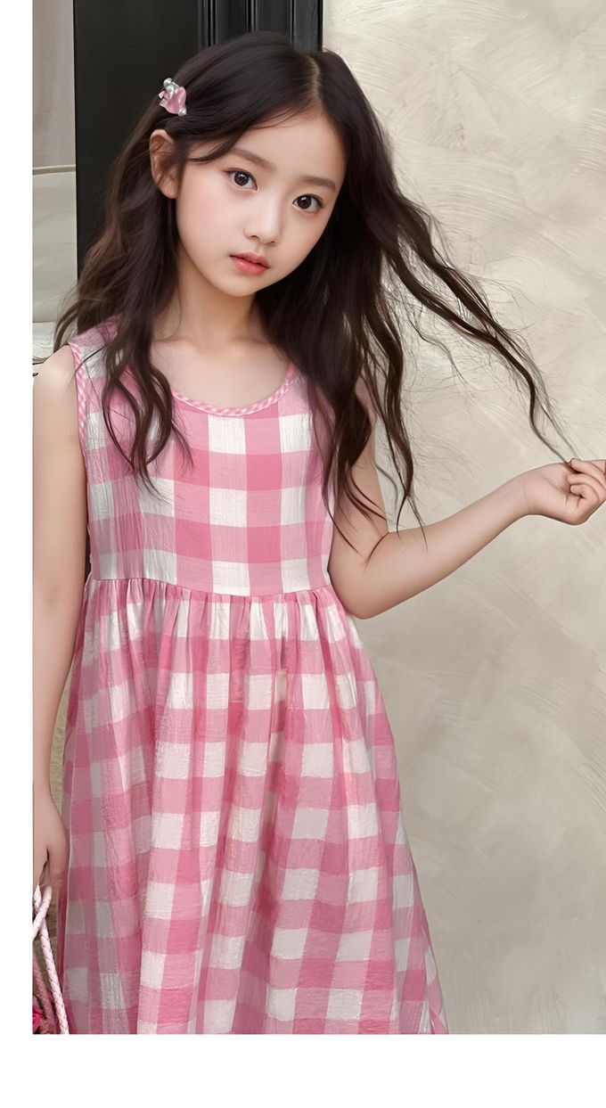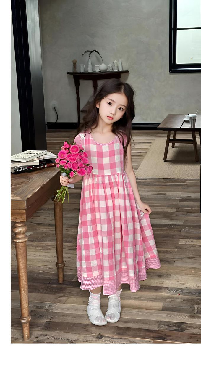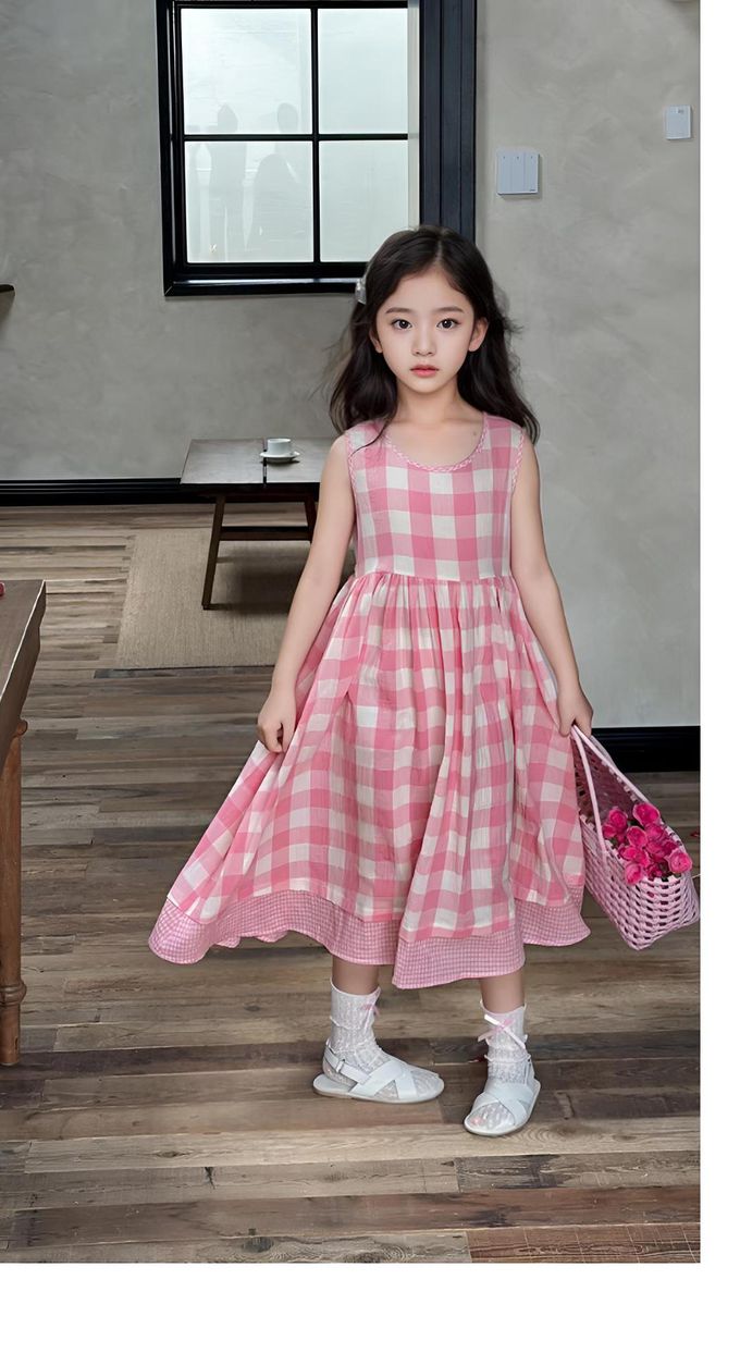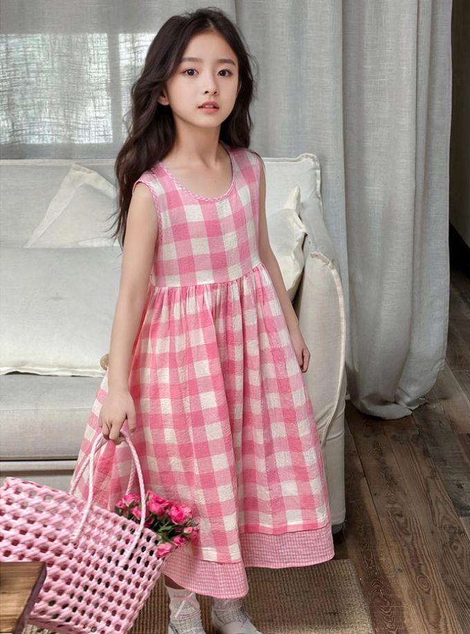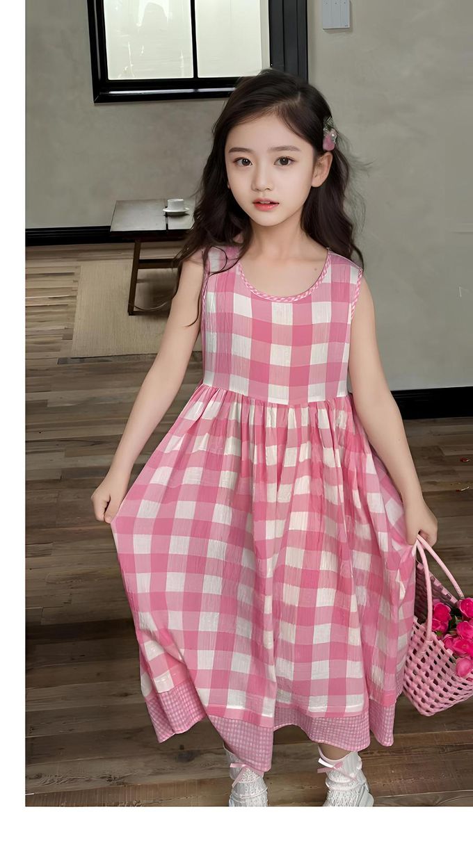 純棉圓領腰綁帶無袖長洋裝-格子-粉色