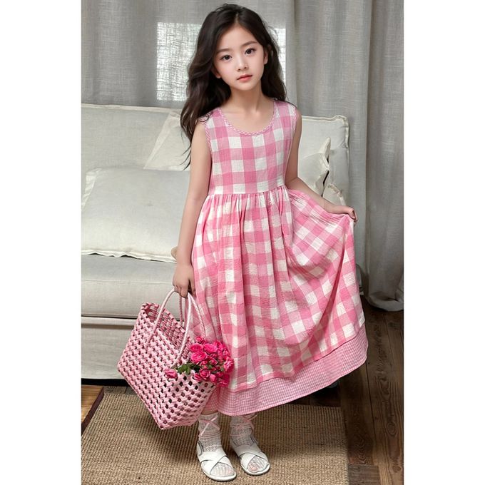 Wawama - 純棉圓領腰綁帶無袖長洋裝-格子-粉色