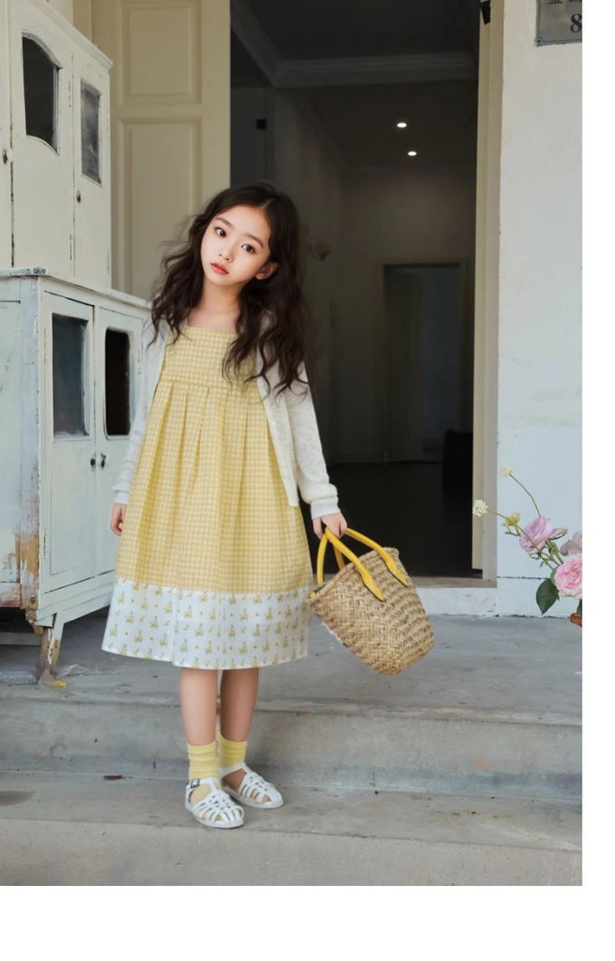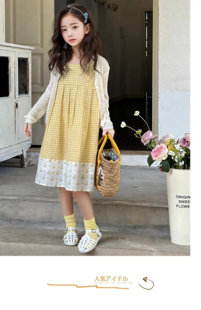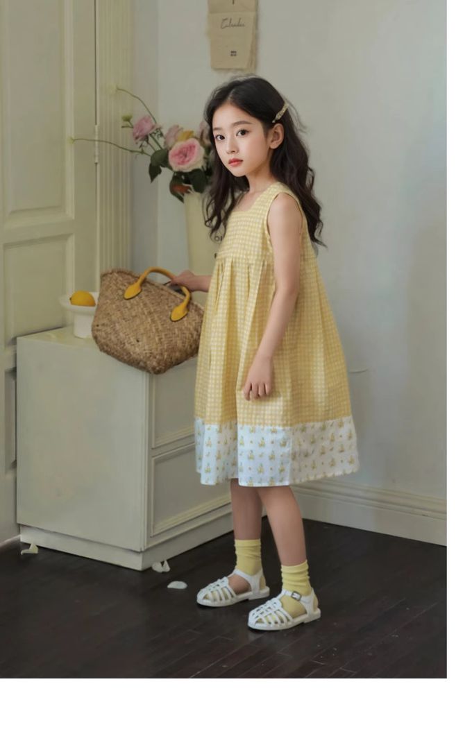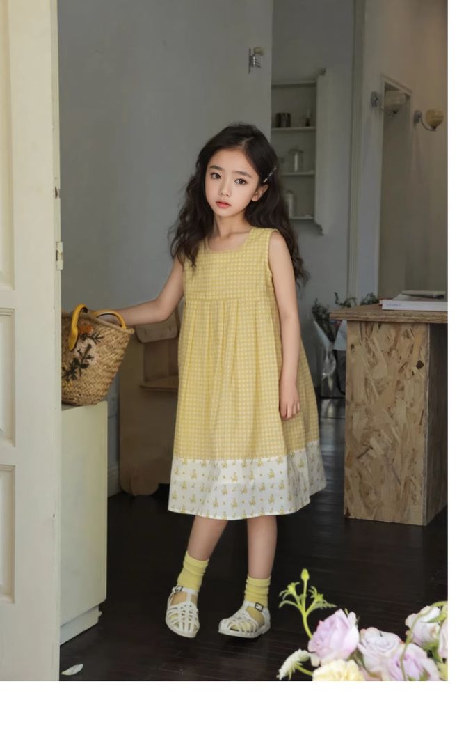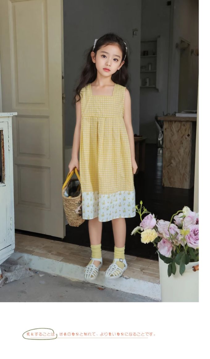 Wawama - 純棉方領拼接無袖洋裝-格子+碎花-黃色 (130cm)