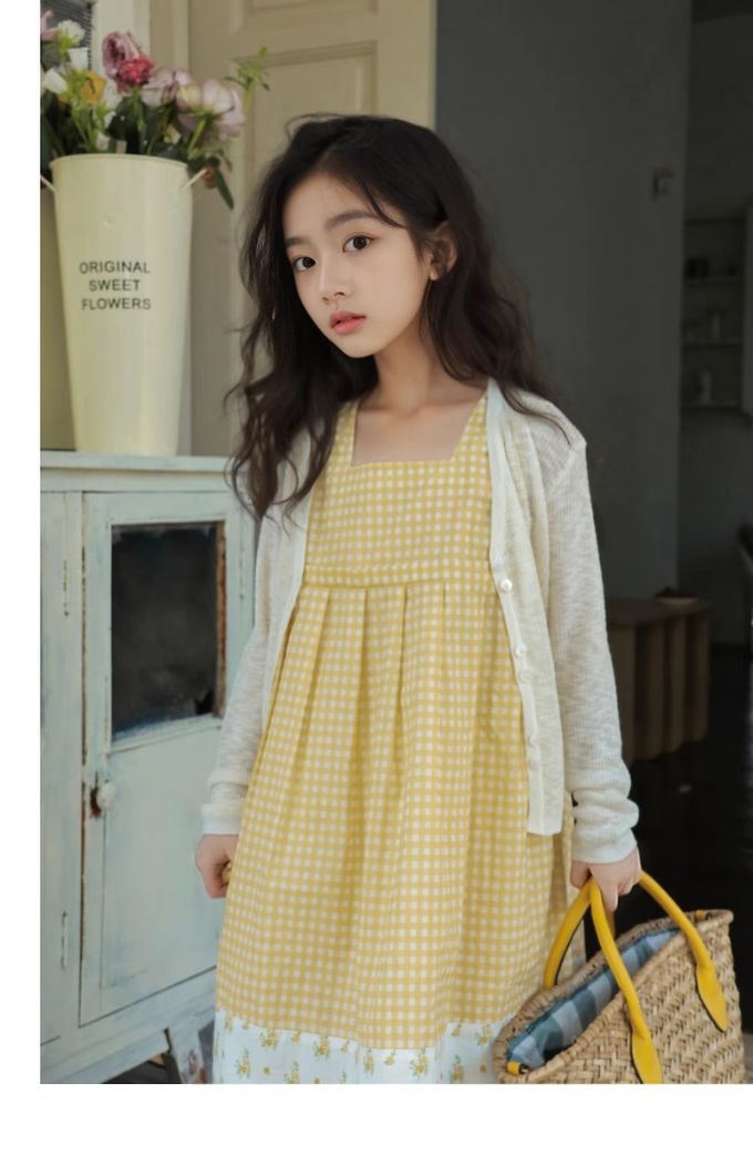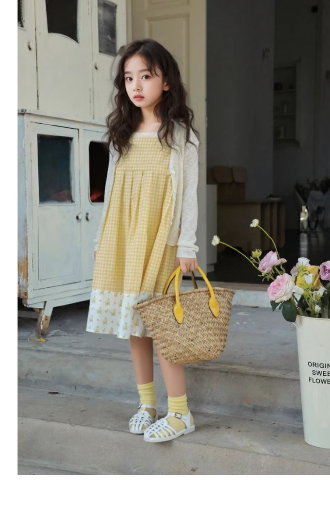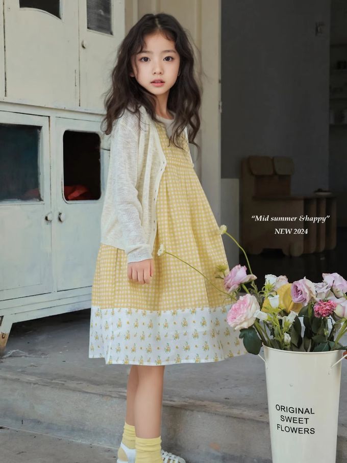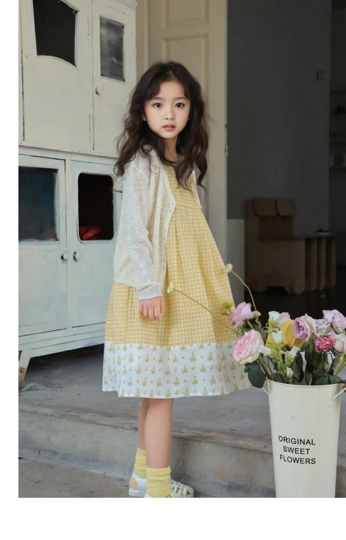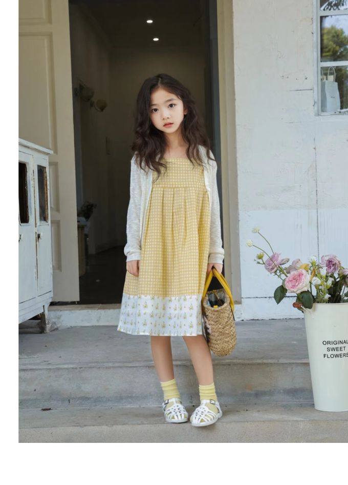 Wawama - 純棉方領拼接無袖洋裝-格子+碎花-黃色 (130cm)