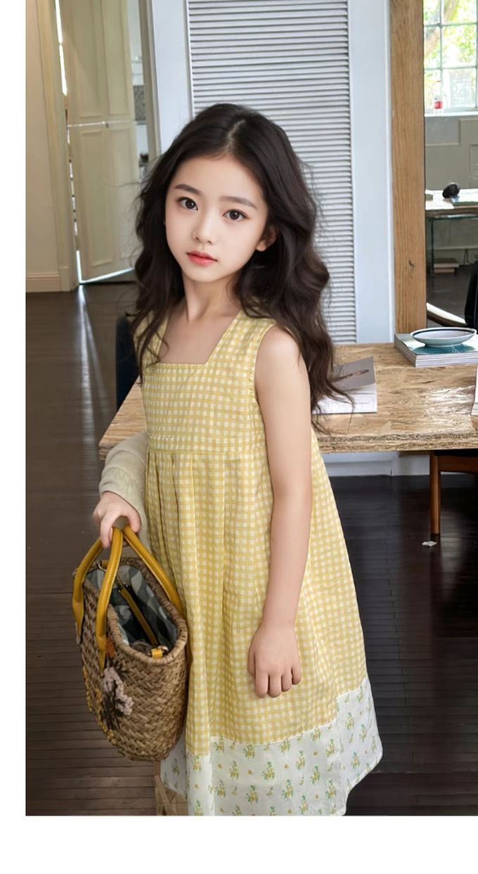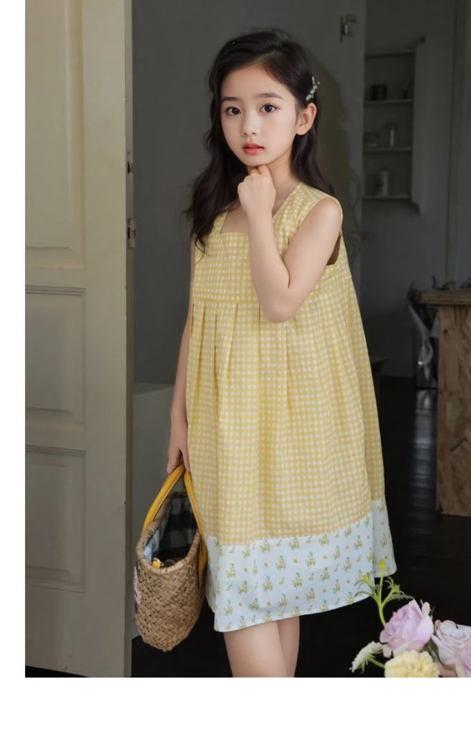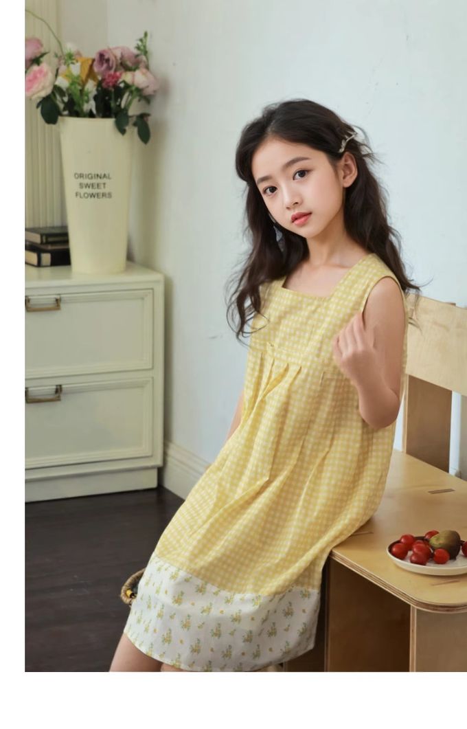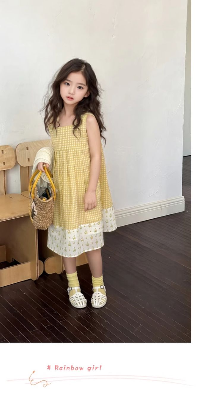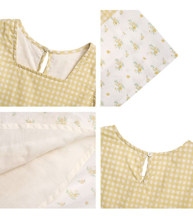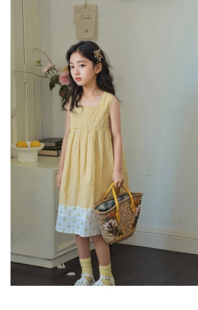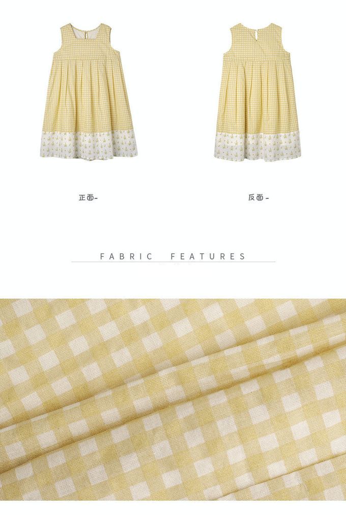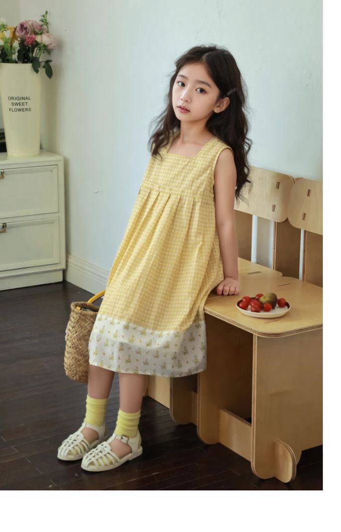 純棉方領拼接無袖洋裝-格子+碎花-黃色
