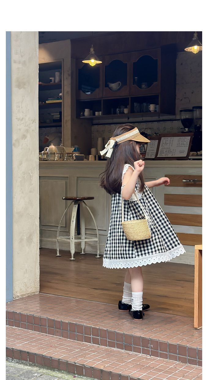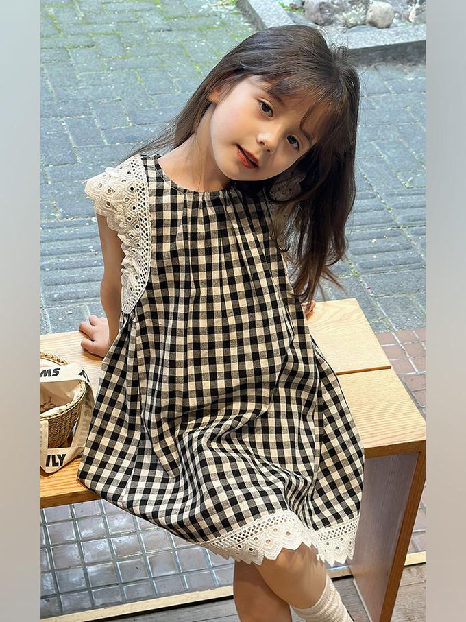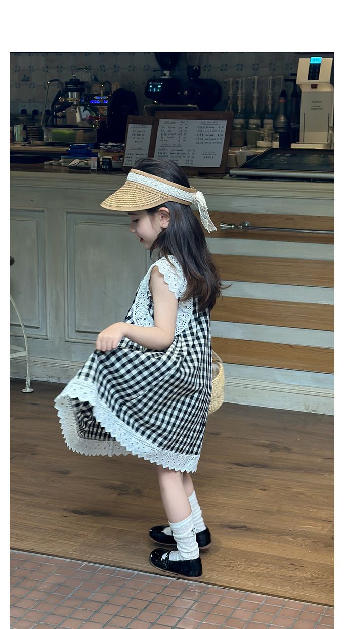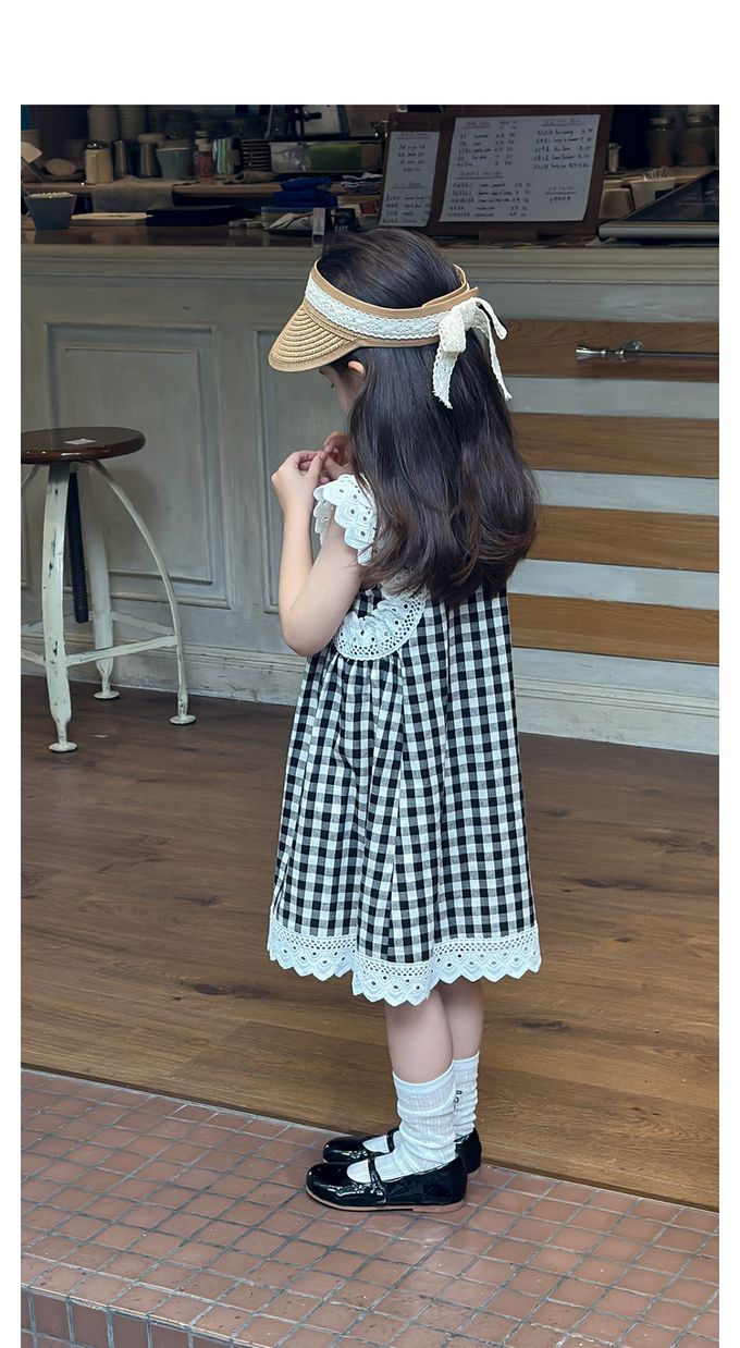 純棉蕾絲拼接無袖洋裝-格子-黑色