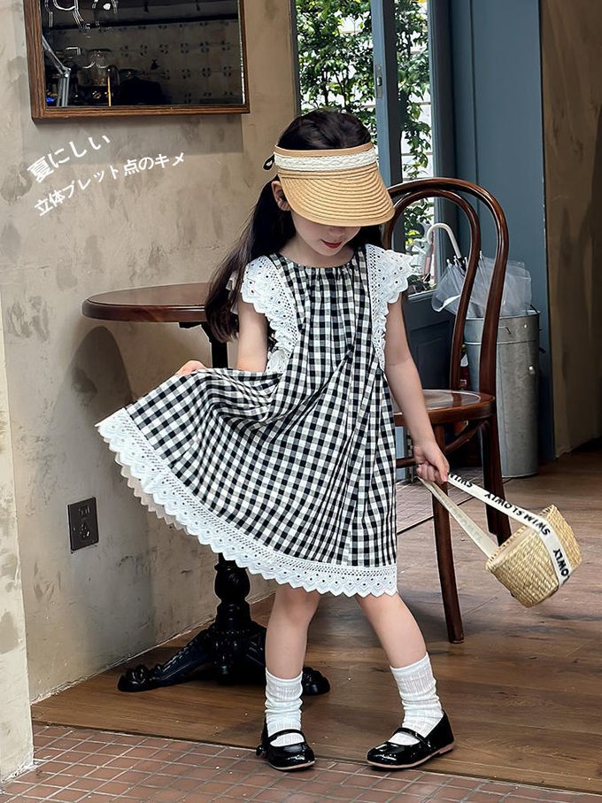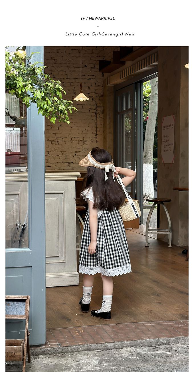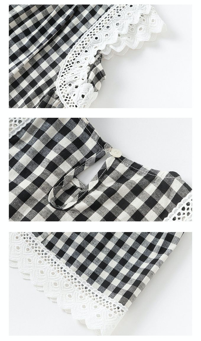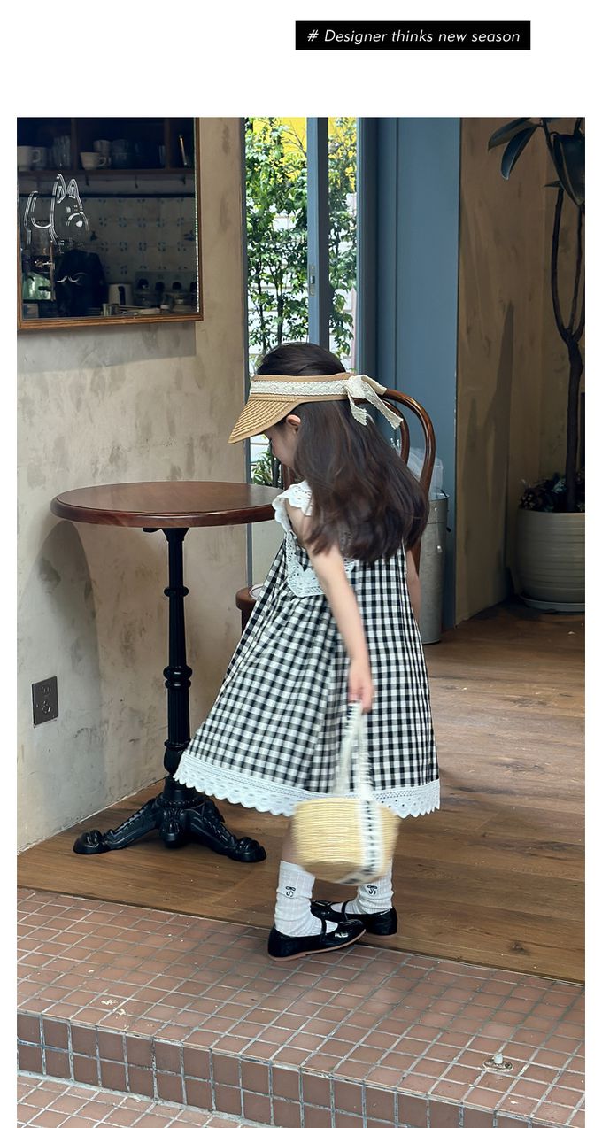 純棉蕾絲拼接無袖洋裝-格子-黑色