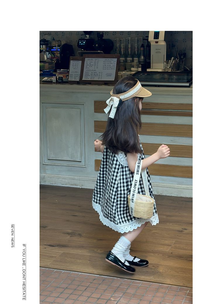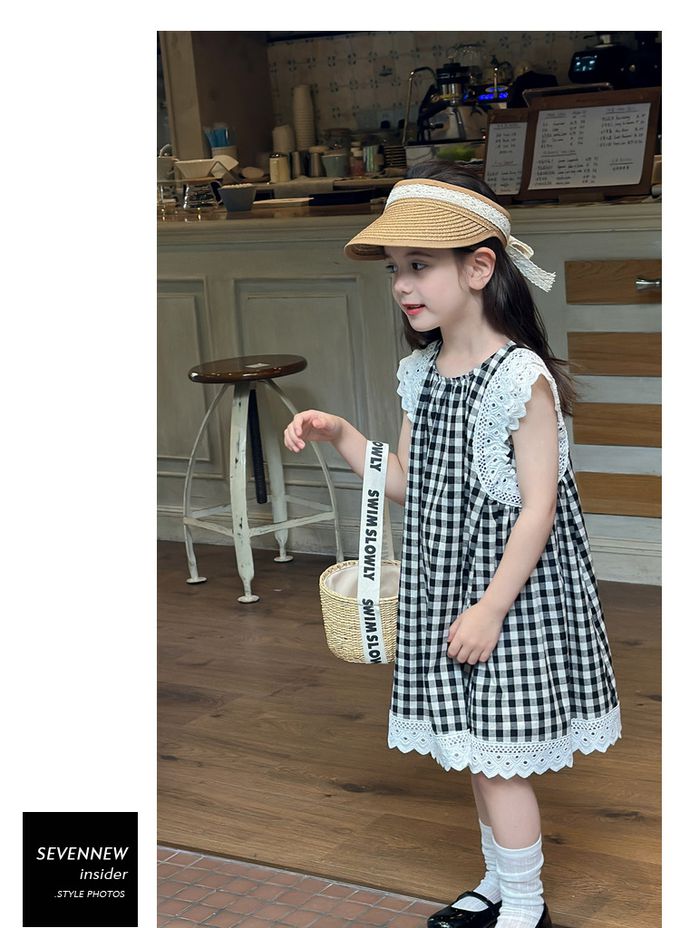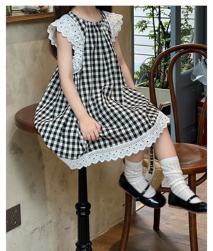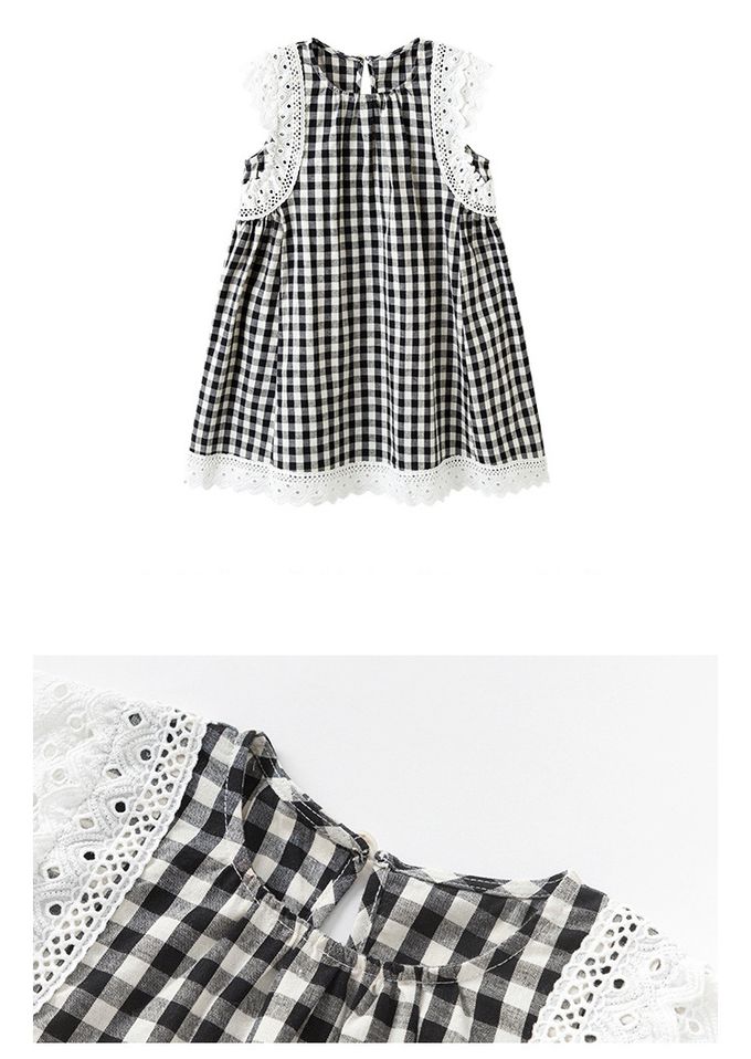 Wawama - 純棉蕾絲拼接無袖洋裝-格子-黑色