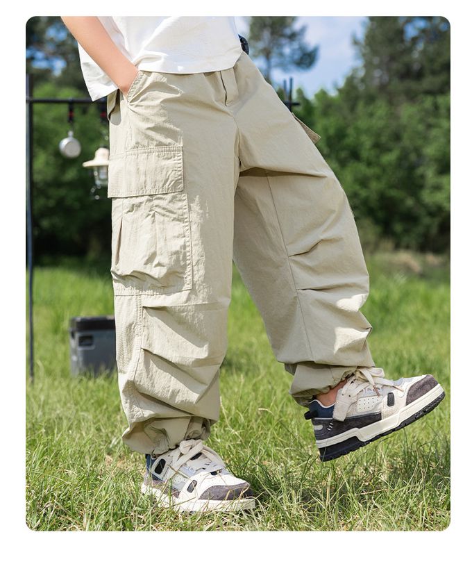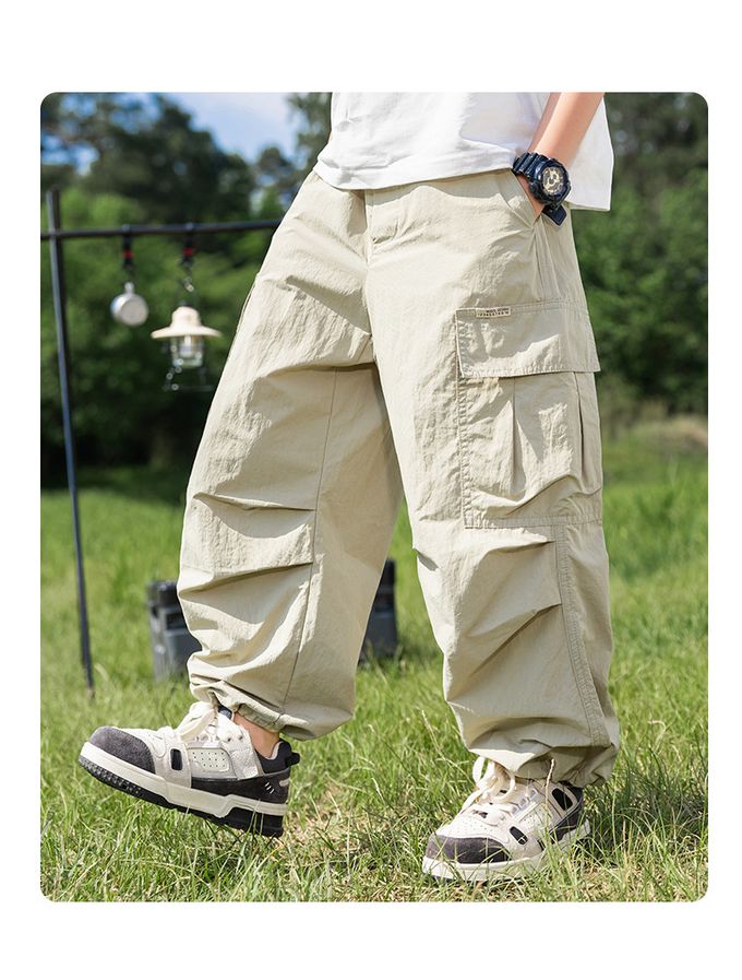 純棉腰鬆緊工裝休閒長褲/防蚊褲-立體口袋-卡其色