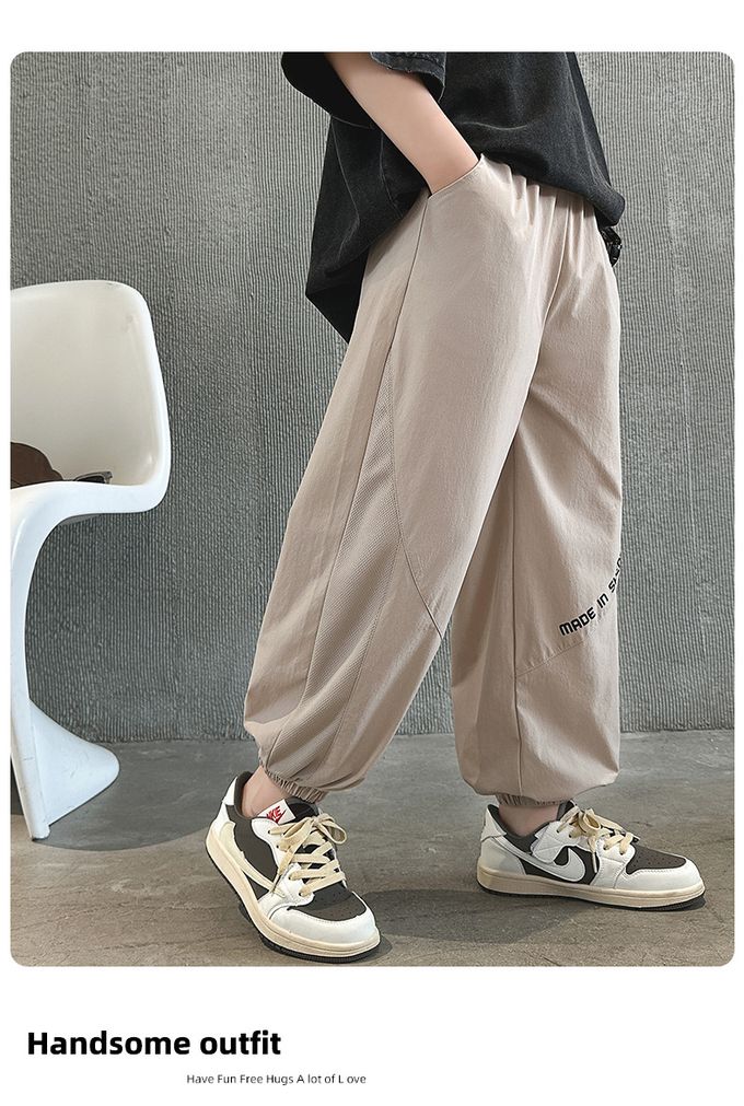 腰鬆緊休閒束口長褲/防蚊褲-透氣網孔-卡其色