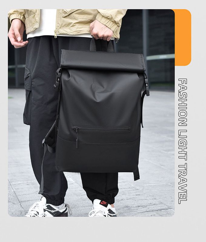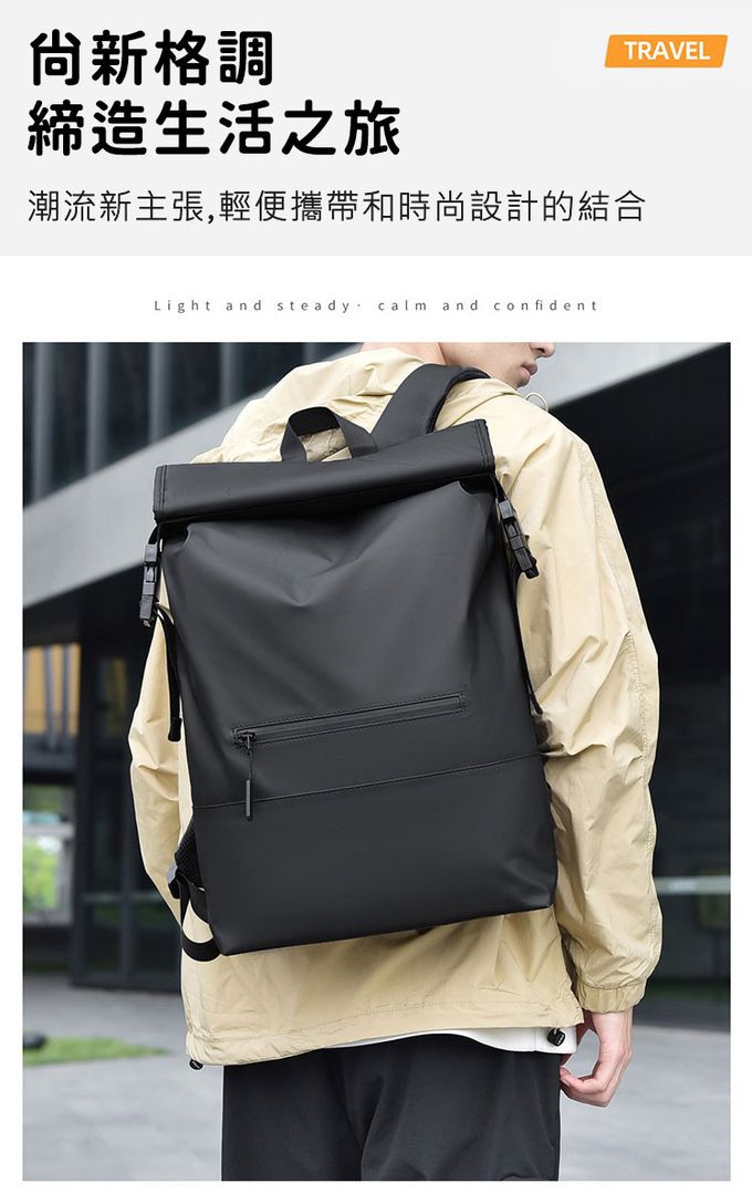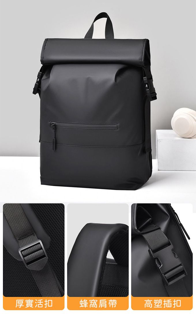 輕量級高質感防潑水上班通勤旅行雙肩包/捲口後背包-黑
