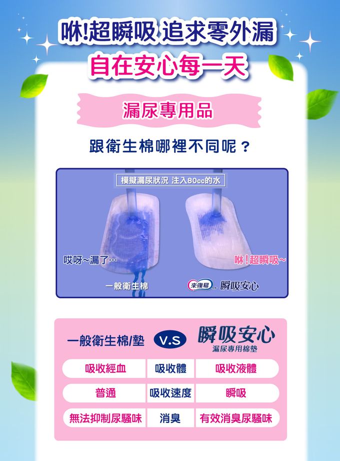 材質:表面-PO聚烯烴不織布、吸收材-高分子吸收體、棉狀紙漿、吸水紙