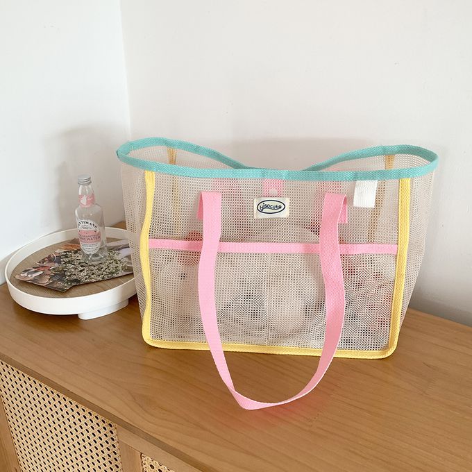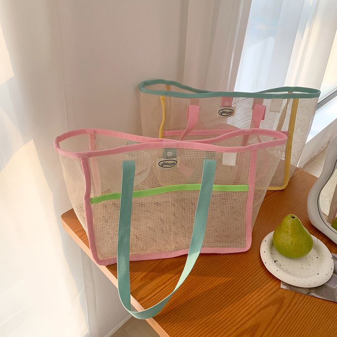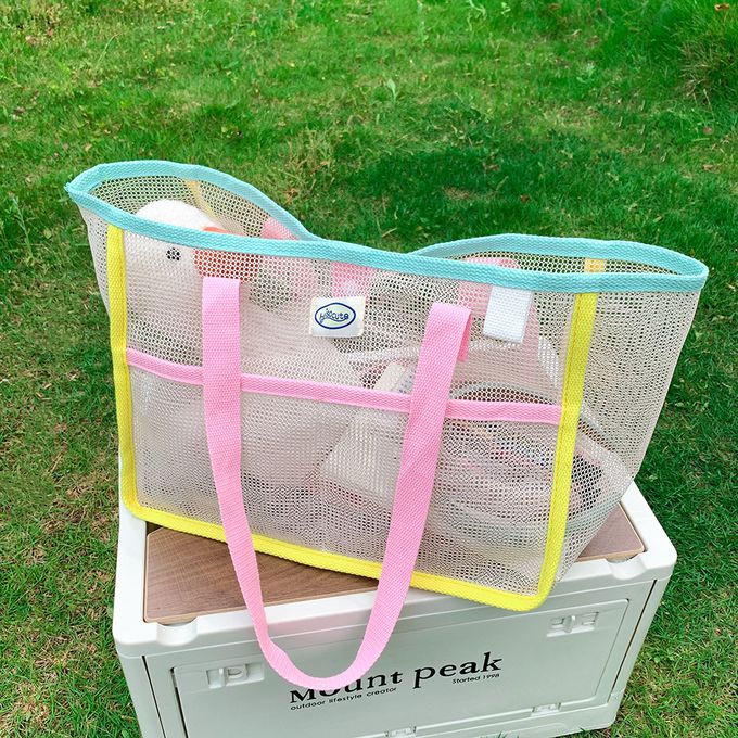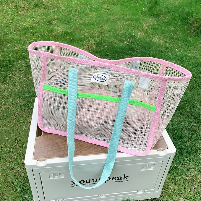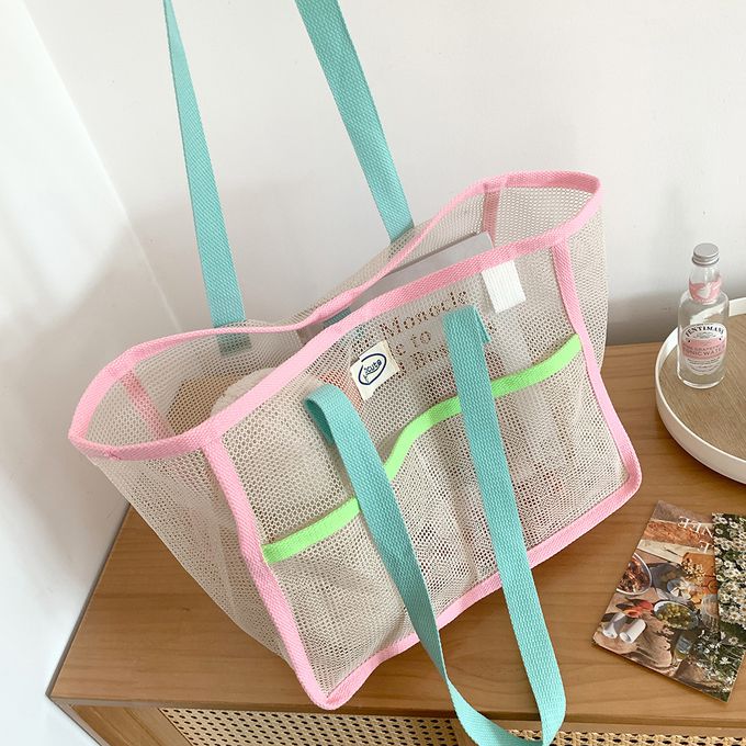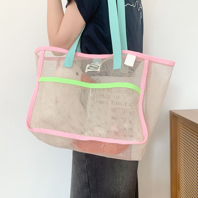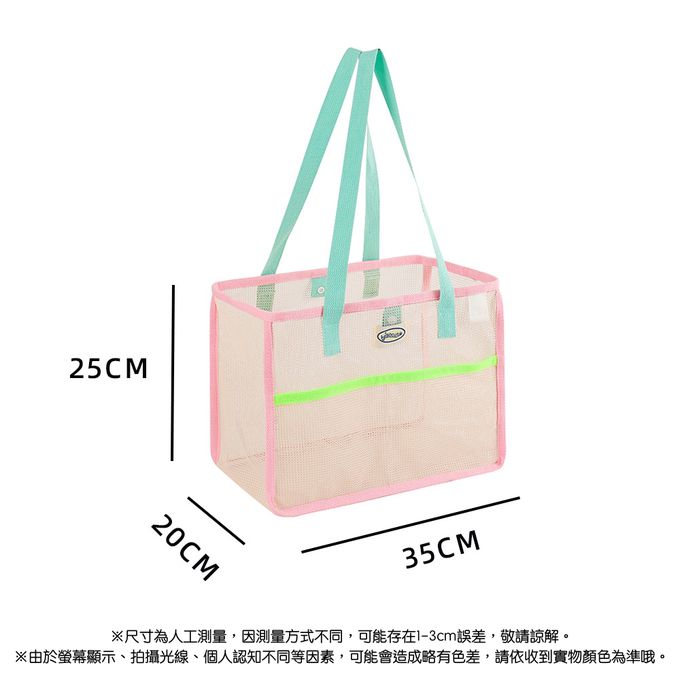 實用輕便肩背網紗包/沙灘包-拼色綠 (25×20×35cm)