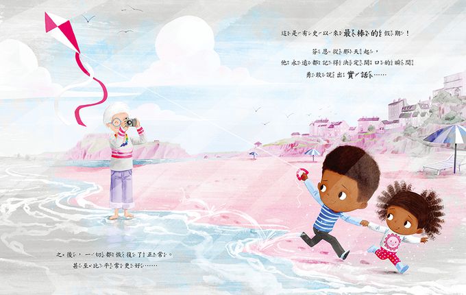 小謊話就像一顆顆彈力球似的彈出來,從第一個桃紅色的,接著第二顆藍色、第三顆綠色……漸漸的芬恩被十幾顆空氣彈力球緊緊包圍了,突然覺得什麼都變得不好玩、不好吃了,快樂的度假為什麼突然會變成這樣呢?
