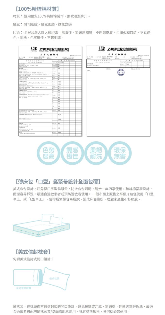 ●榮獲美國FDA(美國食品暨藥物檢驗局)醫療認證及美國IBT實驗室防蟎認證、SGS不含甲醛及螢光劑等有害人體物質,安全無毒更環保。