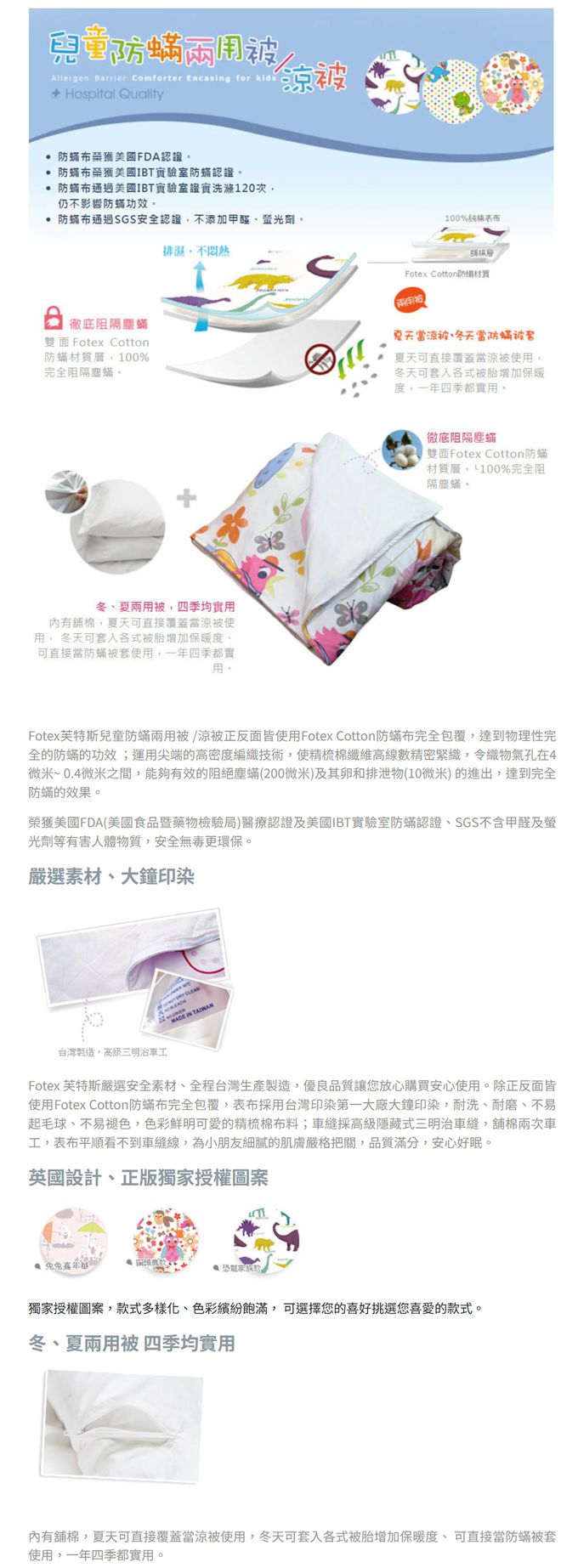 Fotex 芙特斯嚴選安全素材、全程台灣生產製造,優良品質讓您放心購買安心使用。除正反面皆使用Fotex Cotton防蟎布完全包覆,表布採用台灣印染第一大廠大鐘印染,耐洗、耐磨、不易起毛球、不易褪色,色彩鮮明可愛的精梳棉布料;車縫採高級隱藏式三明治車縫,舖棉兩次車工,表布平順看不到車縫線,為小朋友細膩的肌膚嚴格把關,品質滿分,安心好眠。
